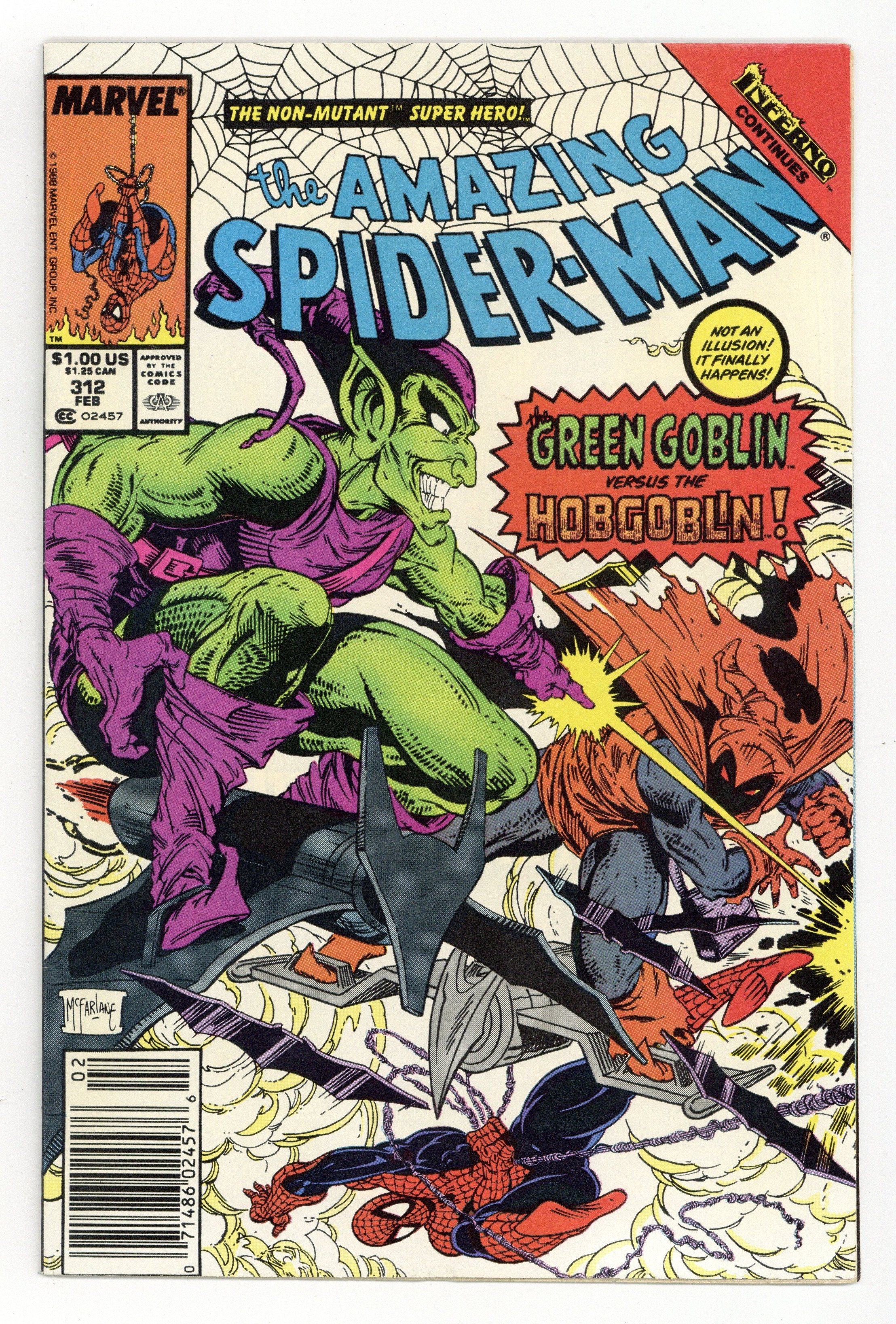 Newsstand Edition. "The Goblin War!" Inferno crossover. Script by David Michelinie. Art by Todd McFarlane. Cover by Todd McFarlane. Story continues from Web of Spider-Man 47. With his family in danger, the Green Goblin rides again! Oh my, does Harry know what he's doing by challenging the might of the Hobgoblin? In the skies above the Osborn Chemical Company, the pumpkin bombs fly as the goblins clash! And naturally your friendly neighborhood Spider-Man is caught in the middle! Meanwhile the effects of Inferno begin affecting Dr. Curt Connors. Uh-oh, could an appearance from the Lethal Lizard be in the near future? Yesss! Story continues in Spectacular Spider-Man 147. Cameo appearances by Mary Jane Watson, Liz Osborn, and J. Jonah Jameson. (Note: Harry Osborn dons the garb of the Green Goblin for the first time since Amazing Spider-Man 180.) 36 pgs. Cover price $1.00.