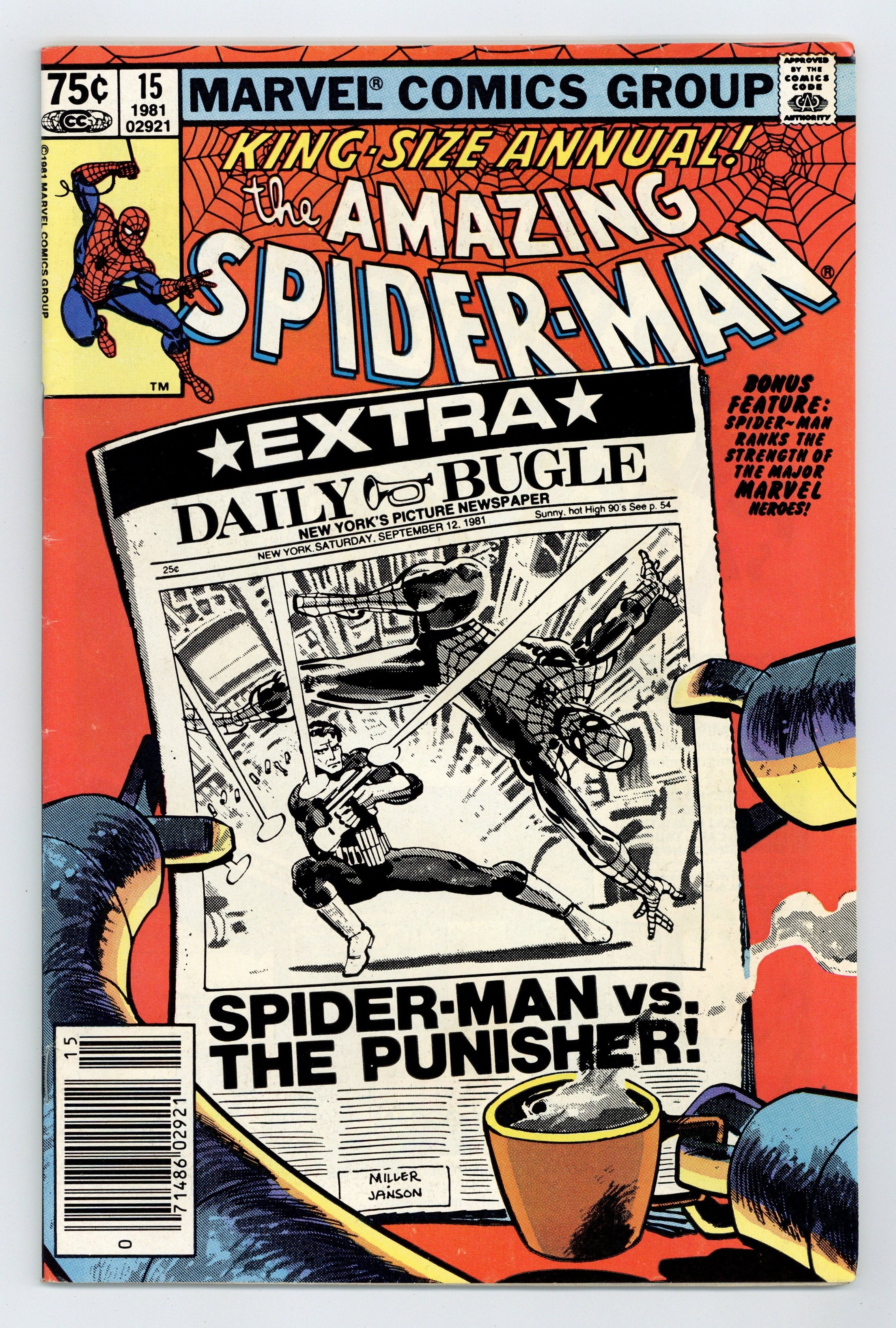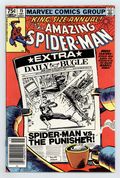 Newsstand Edition. "Spider-Man: Threat or Menace?" Guest-starring the Punisher. Script by Denny O'Neil. Art by Frank Miller (breakdowns) and Klaus Janson (finishes). Cover by Frank Miller and Klaus Janson. The dynamic art tandem that took the Daredevil series to new heights in the early 1980's teams up to bring Spider-Man and the Punisher together again! But this time the web-slinger and the gun-toting vigilante are not facing the likes of Jigsaw or the Hitman! Their adversary is a certain six-armed super-villain...planning nothing less than the murder of five million people! The Punisher takes the first shot at Dr. Octopus in the city morgue! And later on the wondrous wall-crawler takes the last one at the Daily Bugle! Can Spidey get the story to press before Doc Ock? An excellent annual! Second feature: "Just How Strong Is...Spider-Man?" Script by Mark Gruenwald. Art by Mark Gruenwald (layouts) and Bob Layton (finishes). The heroes of the Marvel Universe are ranked in order of their physical strength. The first tier consists of the Hulk, Hercules, Thor, Wonder Man, and Iron Man. The Thing and the Sub-Mariner headline the second tier. Spider-Man is in the third tier. This may be the first such "power ranking" attempted...thus making it a landmark backup feature. Third feature: "Peter Parker's Apartment!" Script by Roger Stern. Art by Marie Severin and Terry Austin. One-page illustration of Peter's Chelsea apartment correcting the errors in Amazing Spider-Man Annual 13. Fourth feature: "A Gallery of Spider-Man's Most Famous Foes!" Script by Roger Stern. Art by Keith Pollard, Greg LaRocque, and Frank Giacoia. 4 pages of pin-ups featuring the Man-Wolf, Jackal, Punisher, and Tarantula. (Notes: Dr. Octopus previously appeared in Captain America 259. The Punisher appears next in Daredevil 181 & 182. This story was reprinted in the trade paperback The Sensational Spider-Man (1988); and also in the (1994) Complete Frank Miller Spider-Man.) 52 pages. Cover price $0.75.