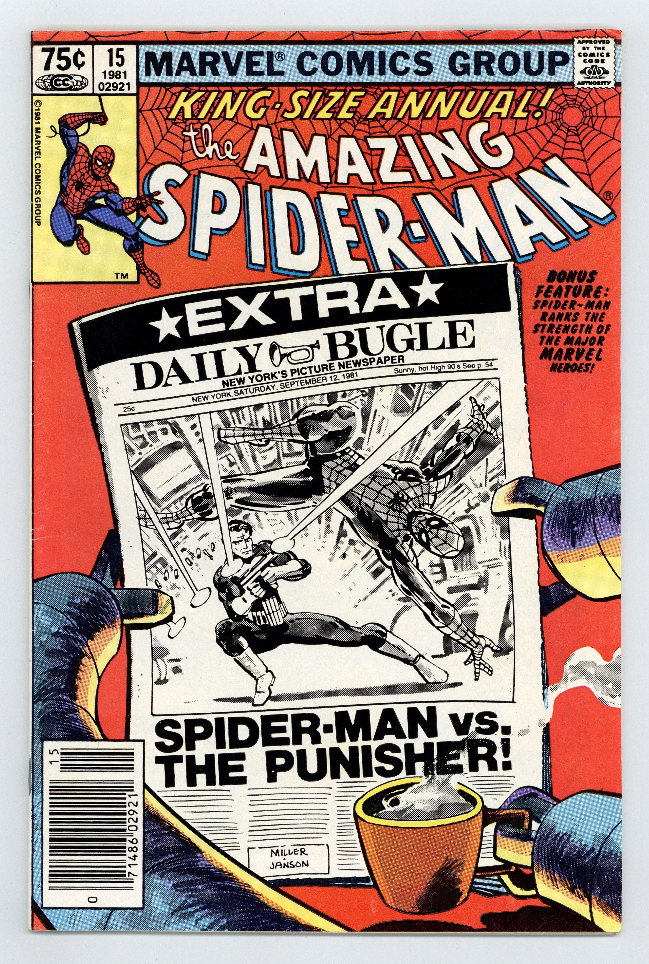 Tags: Spider-Man$18.00Newsstand Edition. "Spider-Man: Threat or Menace?" Guest-starring the Punisher. Script by Denny O'Neil. Art by Frank Miller (breakdowns) and Klaus Janson (finishes). Cover by Frank Miller and Klaus Janson. The dynamic art tandem that took the Daredevil series to new heights in the early 1980's teams up to bring Spider-Man and the Punisher together again! But this time the web-slinger and the gun-toting vigilante are not facing the likes of Jigsaw or the Hitman! Their adversary is a certain six-armed super-villain...planning nothing less than the murder of five million people! The Punisher takes the first shot at Dr. Octopus in the city morgue! And later on the wondrous wall-crawler takes the last one at the Daily Bugle! Can Spidey get the story to press before Doc Ock? An excellent annual! Second feature: "Just How Strong Is...Spider-Man?" Script by Mark Gruenwald. Art by Mark Gruenwald (layouts) and Bob Layton (finishes). The heroes of the Marvel Universe are ranked in order of their physical strength. The first tier consists of the Hulk, Hercules, Thor, Wonder Man, and Iron Man. The Thing and the Sub-Mariner headline the second tier. Spider-Man is in the third tier. This may be the first such "power ranking" attempted...thus making it a landmark backup feature. Third feature: "Peter Parker's Apartment!" Script by Roger Stern. Art by Marie Severin and Terry Austin. One-page illustration of Peter's Chelsea apartment correcting the errors in Amazing Spider-Man Annual 13. Fourth feature: "A Gallery of Spider-Man's Most Famous Foes!" Script by Roger Stern. Art by Keith Pollard, Greg LaRocque, and Frank Giacoia. 4 pages of pin-ups featuring the Man-Wolf, Jackal, Punisher, and Tarantula. (Notes: Dr. Octopus previously appeared in Captain America 259. The Punisher appears next in Daredevil 181 & 182. This story was reprinted in the trade paperback The Sensational Spider-Man (1988); and also in the (1994) Complete Frank Miller Spider-Man.) 52 pages. Cover price $0.75.