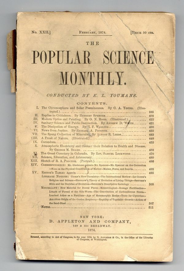 Published Feb 1874 by Popular Science Publishing Co..$32.00- Front cover detached 60%. Back cover detached 60%.