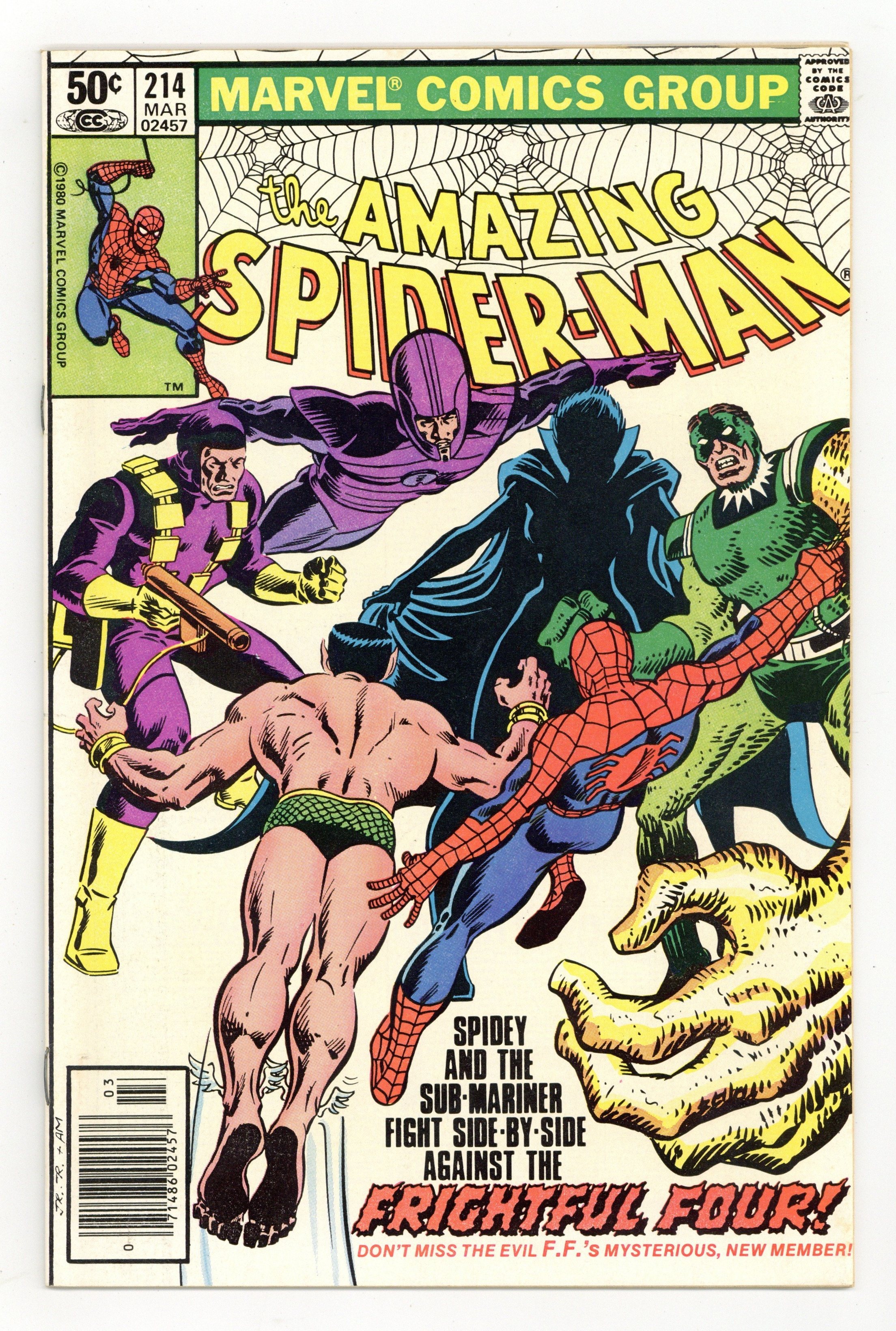 Tags: Spider-Man$23.00Newsstand Edition. "Then Shall We Both Be Betrayed!" Part 2 of 3. Guest-starring the Sub-Mariner. Script by Denny O'Neil. Art by John Romita Jr. (breakdowns) and Jim Mooney (finishes). Cover by John Romita Jr. and Al Milgrom. After torching Peter Parker's Chelsea apartment, the Wizard and Llyra go back to Ryker's Island and free the Sandman and the Trapster! And just like that the Frightful Four is together again! Meanwhile in midtown, a tired web-slinger (and his fellow tenants) check into a nice hotel following their narrow escape from their burning building last issue. But out of the blue the Sub-Mariner smashes into one of the adjoining rooms and threatens Peter's attractive neighbor! Aunt May's nephew is furious! Are Spider-Man and the Avenging Son going to throw down again? Why yes they are! And the winner gets...the Frightful Four! (Notes: Llyra previously appeared in Sub-Mariner (1st series) 50. This issue includes a bizarre full-page parody of the cover to the classic Uncanny X-Men 142 (by Jim Salicrup and Terry Austin). The Sentinel on the cover says: "Hi kids! We're back again! And we've killed all the X-Men! Really! 'Cept Kitty, and she's real small." It's believed that Amazing Spider-Man 214 was the only issue that featured this special advertisement.) 36 pages. Cover price $0.50.
