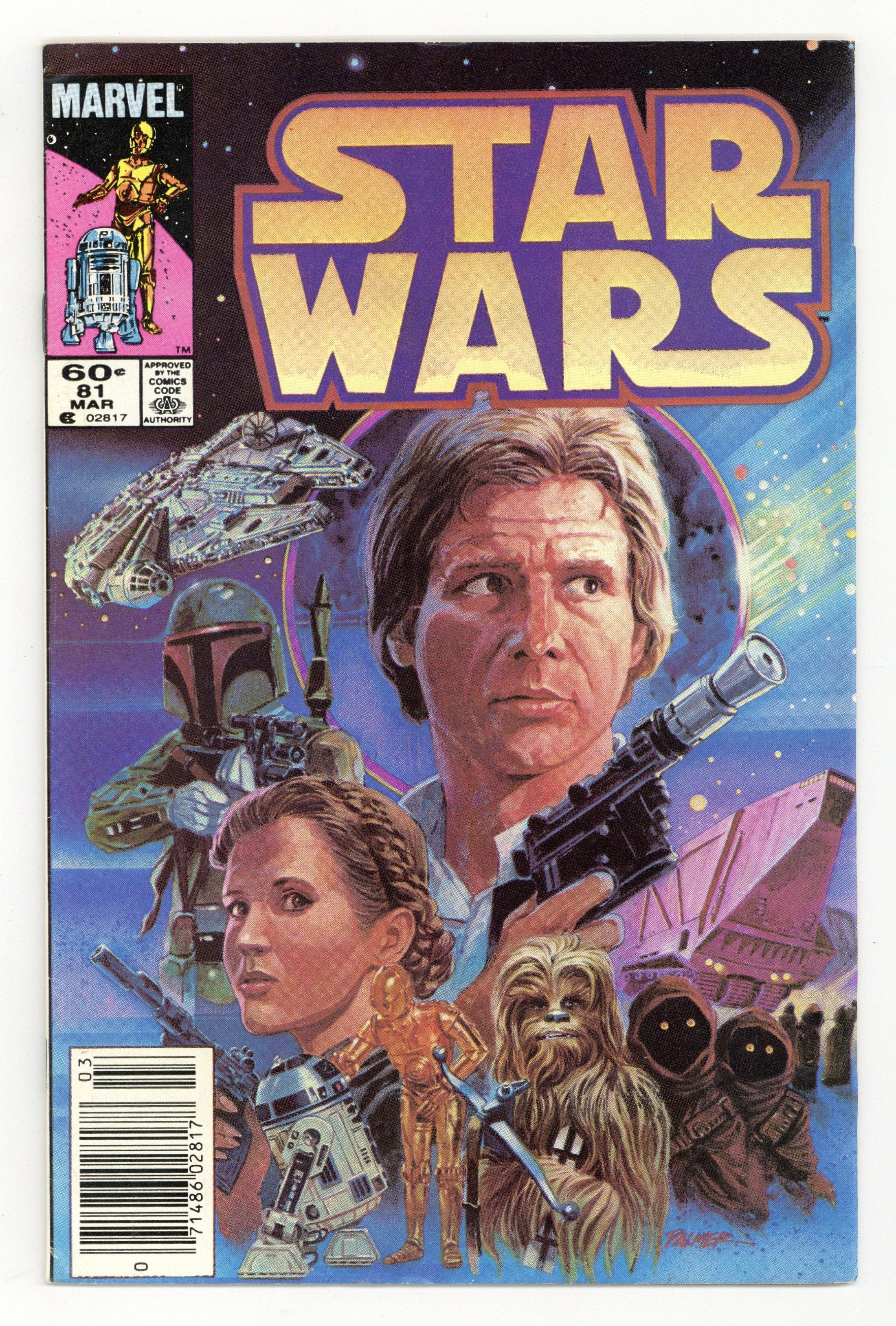 Newsstand Edition. Script by Jo Duffy, breakdowns by Ron Frenz, finishes by Tom Palmer and Tom Mandrake. Cover by Tom Palmer. Han's search for cash brings him, Leia and Artoo to Tatooine, where they encounter an out-from-the-Sarlaac Boba Fett in "Jawas Of Doom". Cover price $0.60.