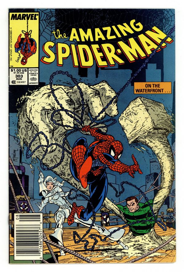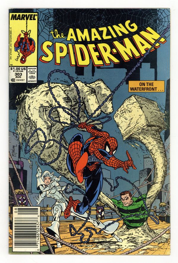 Tags: Spider-Man$20.00Newsstand Edition. "Dock Savage!" Guest-starring Silver Sable. Script by David Michelinie. Art by Todd McFarlane. Cover by Todd McFarlane. While trying to make up his mind about the research company's job offer in Kansas, the wondrous wall-crawler receives another employment offer! However, this one is from Silver Sable and requires brawn not brains! The Symkarian mercenary wants Spider-Man to team up with the Sandman to take down a neo-nazi and his private army! The web-slinger quickly accepts sable's offer and swings into action! As for the other offer, your friendly neighborhood Spider-Man has to talk to his wife first! Cameo appearances by Mary Jane Watson and J. Jonah Jameson. (Notes: Beginning with this issue, Todd McFarlane produces small drawings in the UPC box on the front cover. These sketches only appear on the cover of the direct sales issues. The newsstand editions have the regular bar code.) 36 pgs. Cover price $1.00.