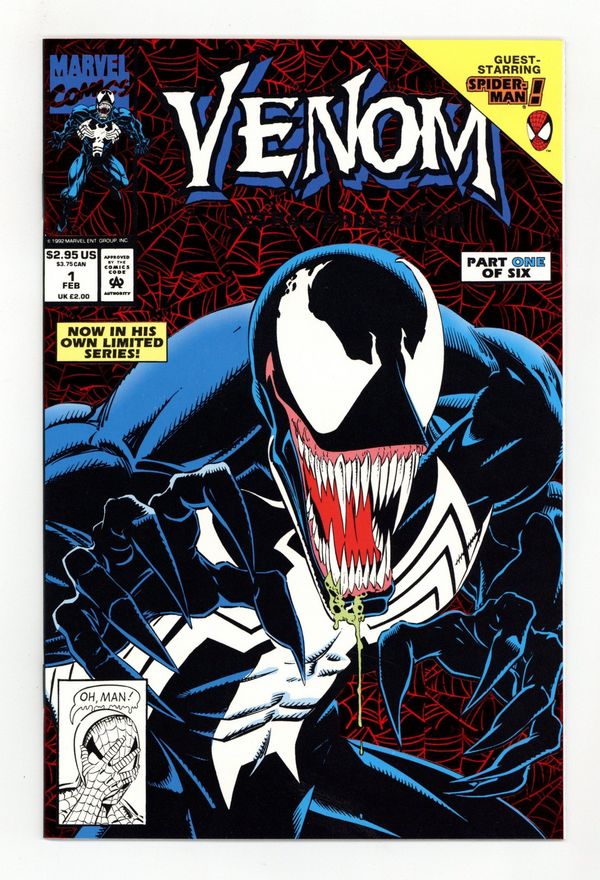 Tags: Marvel Legacy Numbering: Venom (part 1)$32.00Direct Edition. Red Foil Enhanced CardStock cover, art by Mark Bagley and Sam de la Rosa. Lethal Protector Part 1: Dark Soul Drifting, script by David Michelinie, pencils by Mark Bagley, inks by Al Milgrom and Sam de la Rosa; Venom moves to San Fransisco to try out his new protection of innocents racket; Venom and Spidey save a group of homeless folk. 36 pgs., full color. $2.95. Cover price $2.95.