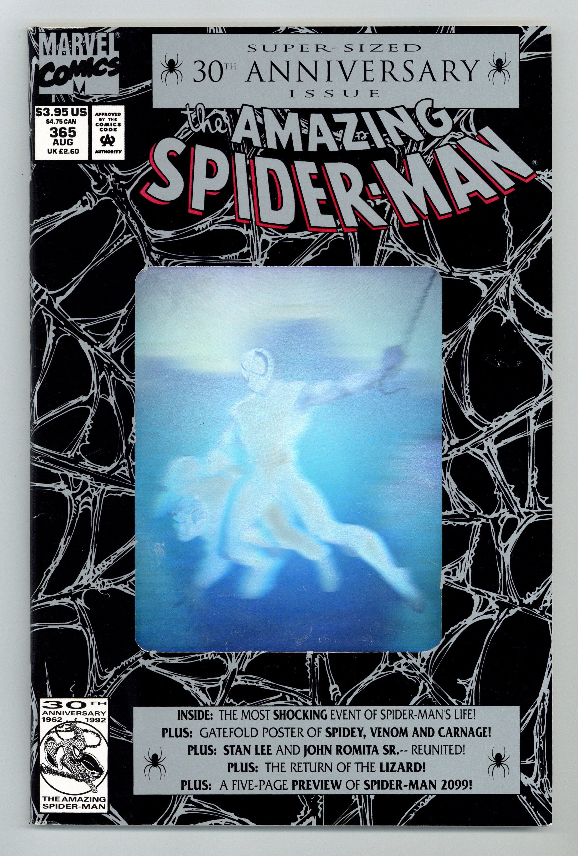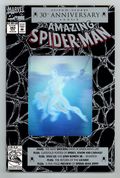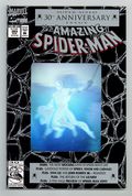 Direct Edition. 80-page giant 30th Anniversary issue, with the first appearance of Spider-Man 2099! The Lizard returns in "Fathers and Sins." Script by David Michelinie, pencils by Mark Bagley, inks by Randy Emberlin. J. Jonah Jameson is featured in "How I Created Spider-Man!" Script by David Michelinie, art by Aaron Lopresti. Gwen Stacy takes center stage in "I Remember Gwen." Script by Stan Lee, plot by Tom DeFalco, art by John Romita Sr. (Cameos by the Green Goblin and Doctor Octopus.) The Prowler is also here in "A Friend in Need." Script by Tom DeFalco, pencils by Tod Smith, inks by Andrew Pepoy. There are also two text pieces, "The Saga of Spidey's Parents" by Stan Lee, and "Spider-Man: The First Thirty Years" by Peter Sanderson. Spider-Man 2099 gets a sneak preview, with a script by Peter David, pencils by Rick Leonardi, and inks by Al Williamson. This issue was originally released with a fold-out poster of Spidey versus Venom and Carnage (poster may be missing in lower grades). 84 pgs. Cover price $3.95.