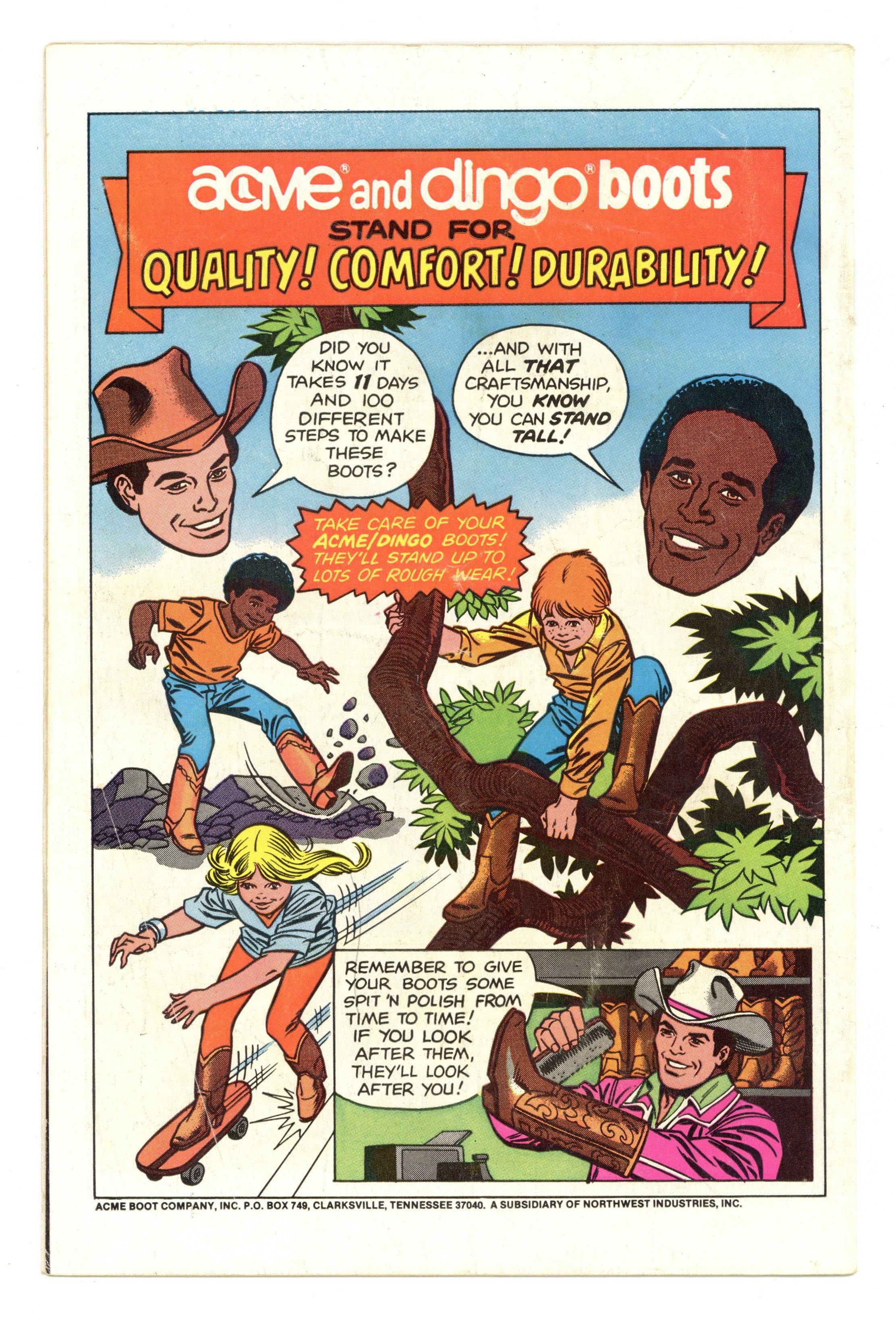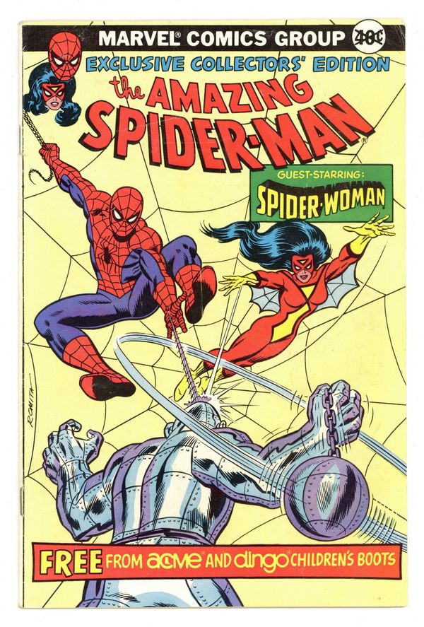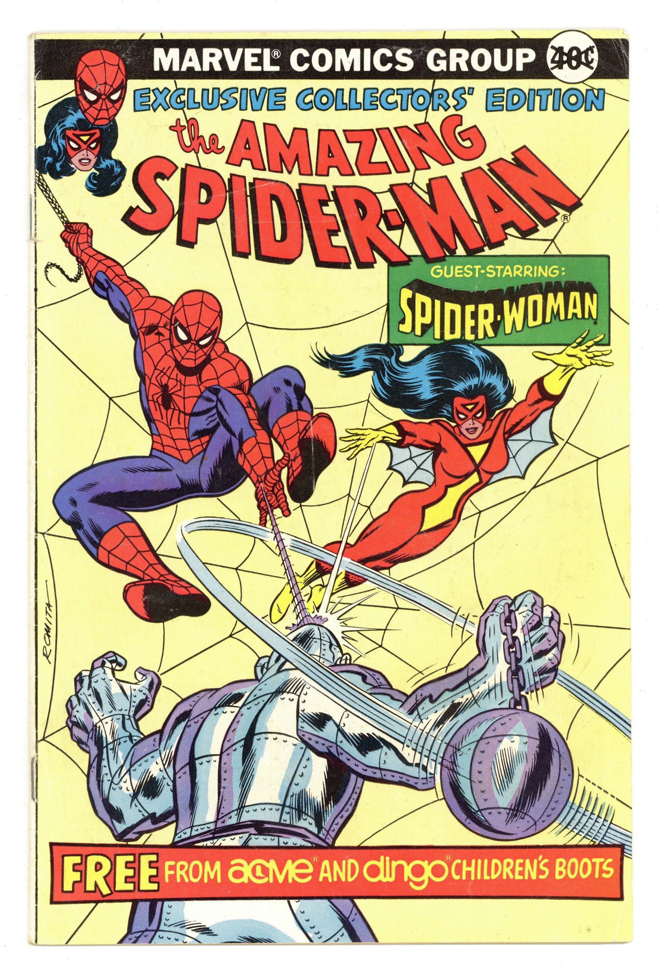 Exclusive Collector's Edition Promotional Comic presented by Acme and Dingo Children's Boots. Guest starring Spider-Woman. Cover by John Romita, Jr. "The Absorbing Man Breaks Loose!" written by David Anthony Kraft & Ed Hannigan, art by Alan Kupperberg & Al Milgrom. Cover price $0.40.