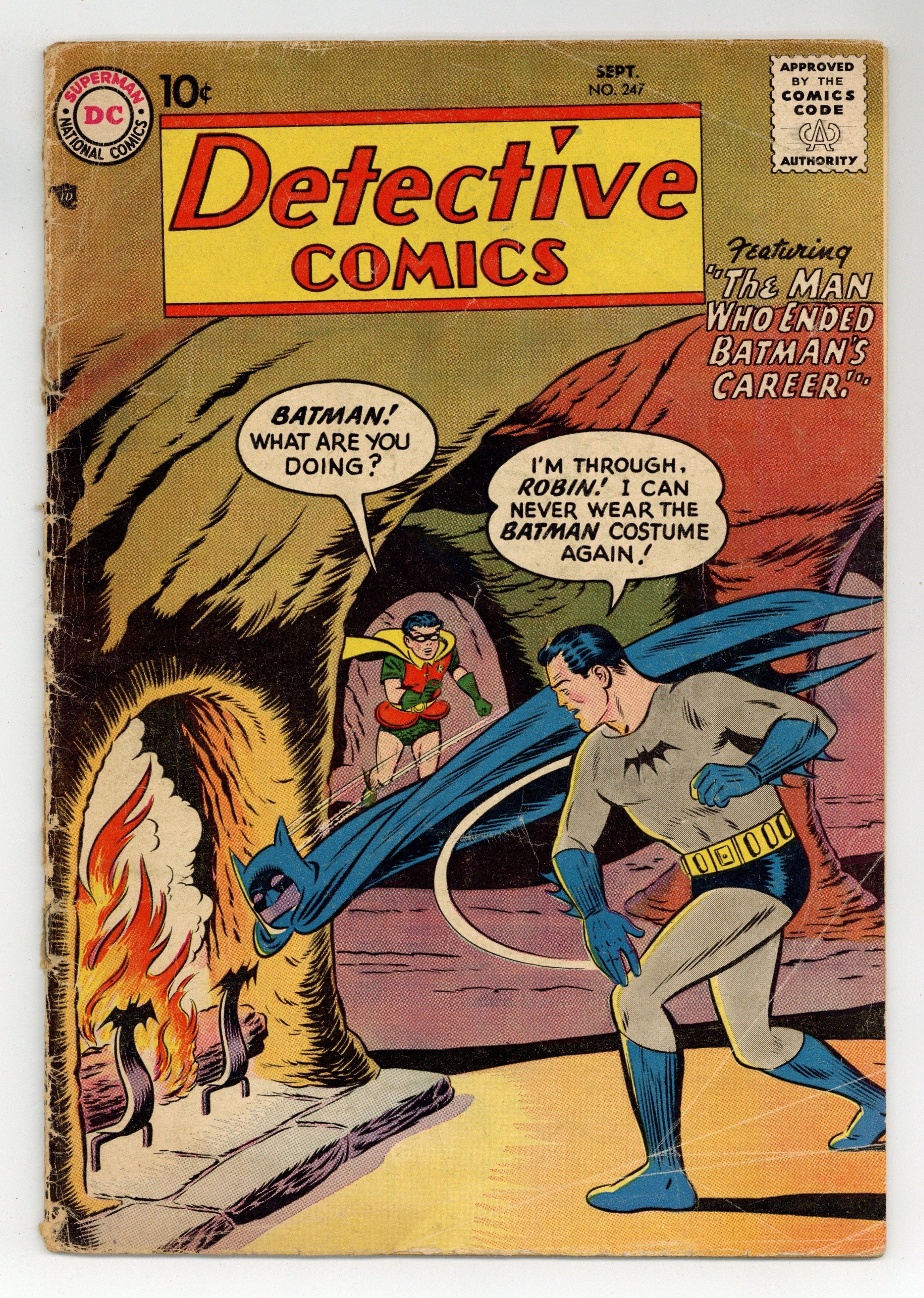 Cover art by Curt Swan and Stan Kaye. The Man Who Ended Batman's Career starring Batman, Robin, and Professor Milo (intro and origin), script by Bill Finger, pencils by Sheldon Moldoff (as Bob Kane), inks by Charles Paris. Danger Prejudice at Work! public service announcement, art by Ruben Moreira. The Mechanical Bloodhound starring Roy Raymond TV Detective, art by Ruben Moreira. Casey the Cop humor page by Henry Boltinoff. The Impossible Messages starring John Jones Manhunter from Mars, script by Jack Miller, art by Joe Certa. 36 pgs. $0.10. Cover price $0.10.