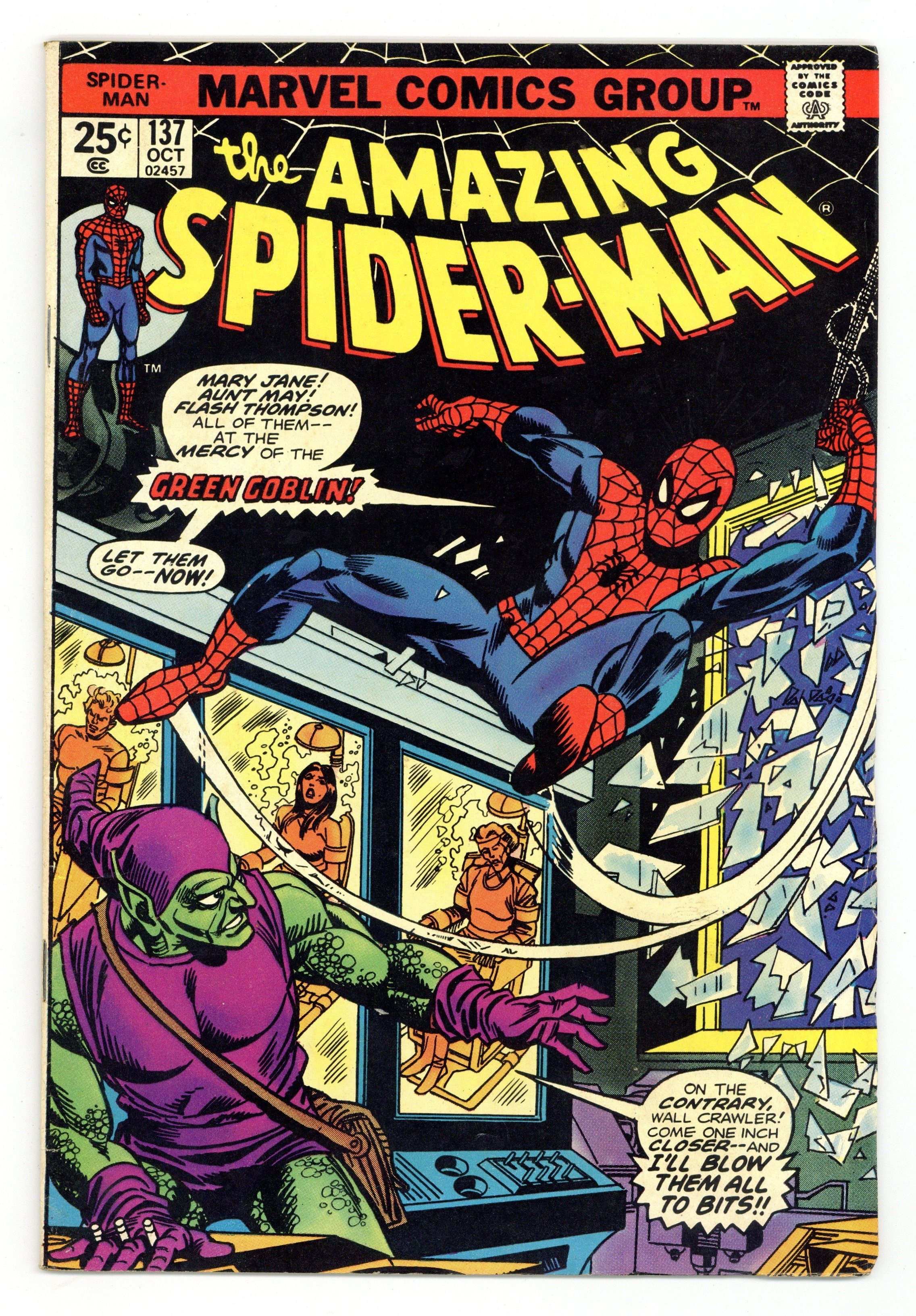 Tags: Marvel Legacy Numbering: Amazing Spider-Man (part 137), Spider-Man$17.25Cover by Gil Kane. Harry Osborn's second appearance as the Green Goblin in Death Trap Times Three, script by Gerry Conway, pencils by Ross Andru, inks by Frank Giacoia and Dave Hunt; Green Goblin attacks a truck carrying radioactive materials; What is the villains end goal with this dangerous bounty?; Plus, Peters friends and family rally to MJs side after she is injured by an explosive; Green Goblin makes Spider-Man choose between saving his friends, or Aunt May! Reprinted in Marvel Tales # 114. Letter to the editor from writer Charles Hoffman. The letters page also has Marvel Value Stamp series A # 99. 36 pgs., full color. $0.25. Cover price $0.25.