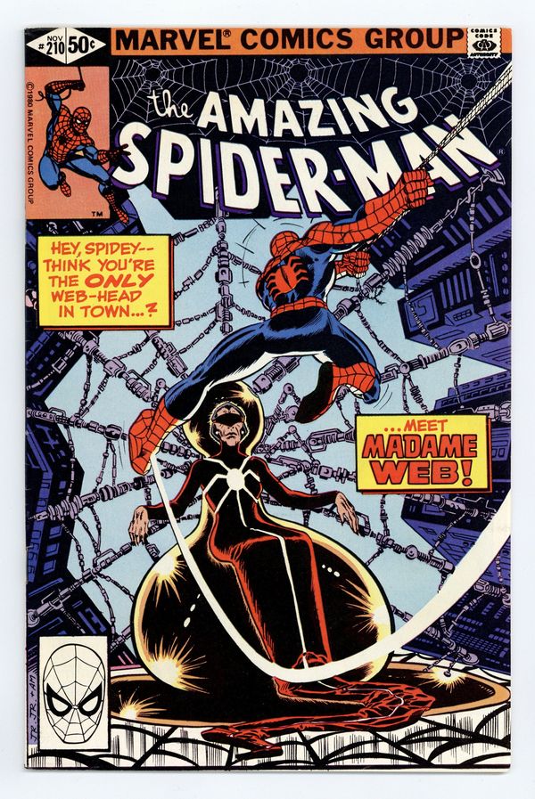 Tags: Marvel Legacy Numbering: Amazing Spider-Man (part 210), Spider-Man$40.00Direct Edition. "The Prophecy of Madame Web!" First appearance of Madame Web. Script by Denny O'Neil. Art by John Romita Jr. (breakdowns) and Joe Sinnott (finishes). Cover by John Romita Jr. and Al Milgrom. Masked gunmen barge into the board room of the Daily Globe and kidnap its publisher K.J. Clayton! Fortunately though, the web-slinger is nearby and gives chase! The wall-crawler doesn't catch the criminals, but he does catch a clue! A mysterious clairvoyant called Madame Web is somehow connected to the victim! After befriending the aging soothsayer and heeding her advice, Spider-Man rushes off to the rescue! Can the web-slinger find the missing publisher and get the Daily Globe back in circulation? Cameo appearance by J. Jonah Jameson. (Notes: Peter Parker ends his employment with the Daily Globe. Madame Web appears next in Amazing Spider-Man 216. John Romita Jr. begins his three-and-a-half year run as the penciler of the Amazing Spider-Man title.) 36 pages, full color. Cover price $0.50.