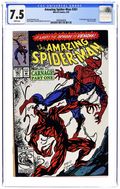 First Printing. Direct Edition. First (full) appearance of Carnage in "Savage Genesis!" Part 1 of 3. Script by David Michelinie. Pencils by Mark Bagley. Inks by Randy Emberlin. Cover by Mark Bagley and Randy Emberlin. Blood runs in the streets as a serial killer roams New York City! And as the web-slinger investigates the murders, he notices a very disturbing similarity to another killer's modus operandi! In a burned-out building in Brooklyn, the spectacular one comes face-to-face with his new homicidal foe...Carnage! Can the wall-crawler end Cletus Kasady's rampage in their very first encounter? Cameo appearances by Aunt May and Mary Jane Watson. Flashback cameo by Venom. (Note: This three-part story was reprinted in 2011 in the trade paperback: Spider-Man -- The Vengeance of Venom.) 36 pages, full color. $1.25 cover price. NOTE: Most of these were distributed with slight printer tears in the bottom edge of the cover. Cover price $1.25.