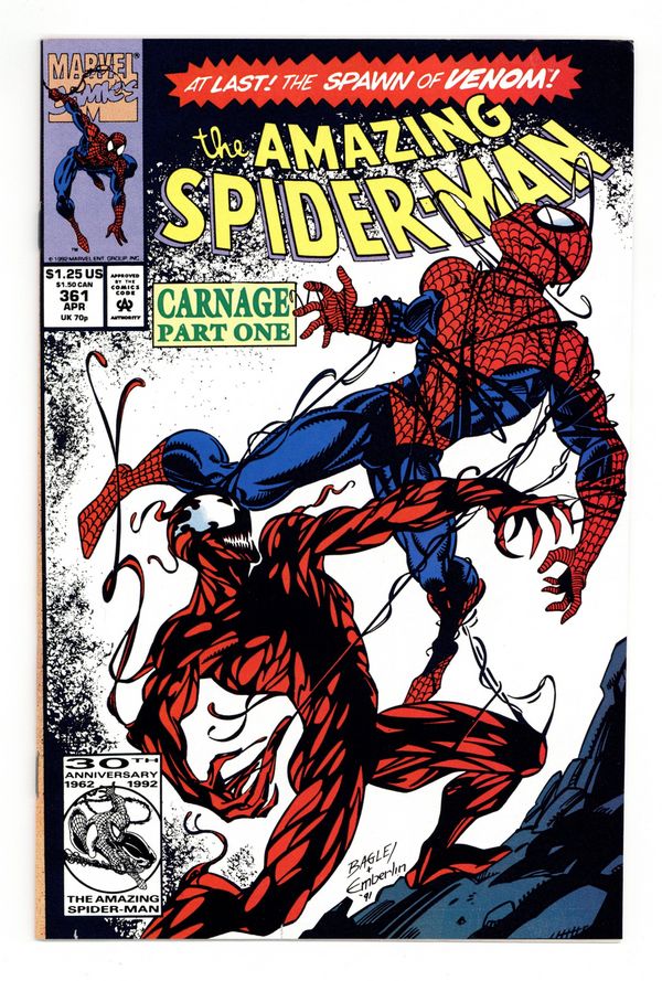 Tags: Marvel Legacy Numbering: Amazing Spider-Man (part 361), Spider-Man$75.00First Printing. Direct Edition. First (full) appearance of Carnage in "Savage Genesis!" Part 1 of 3. Script by David Michelinie. Pencils by Mark Bagley. Inks by Randy Emberlin. Cover by Mark Bagley and Randy Emberlin. Blood runs in the streets as a serial killer roams New York City! And as the web-slinger investigates the murders, he notices a very disturbing similarity to another killer's modus operandi! In a burned-out building in Brooklyn, the spectacular one comes face-to-face with his new homicidal foe...Carnage! Can the wall-crawler end Cletus Kasady's rampage in their very first encounter? Cameo appearances by Aunt May and Mary Jane Watson. Flashback cameo by Venom. (Note: This three-part story was reprinted in 2011 in the trade paperback: Spider-Man -- The Vengeance of Venom.) 36 pages, full color. $1.25 cover price. NOTE: Most of these were distributed with slight printer tears in the bottom edge of the cover. Cover price $1.25.