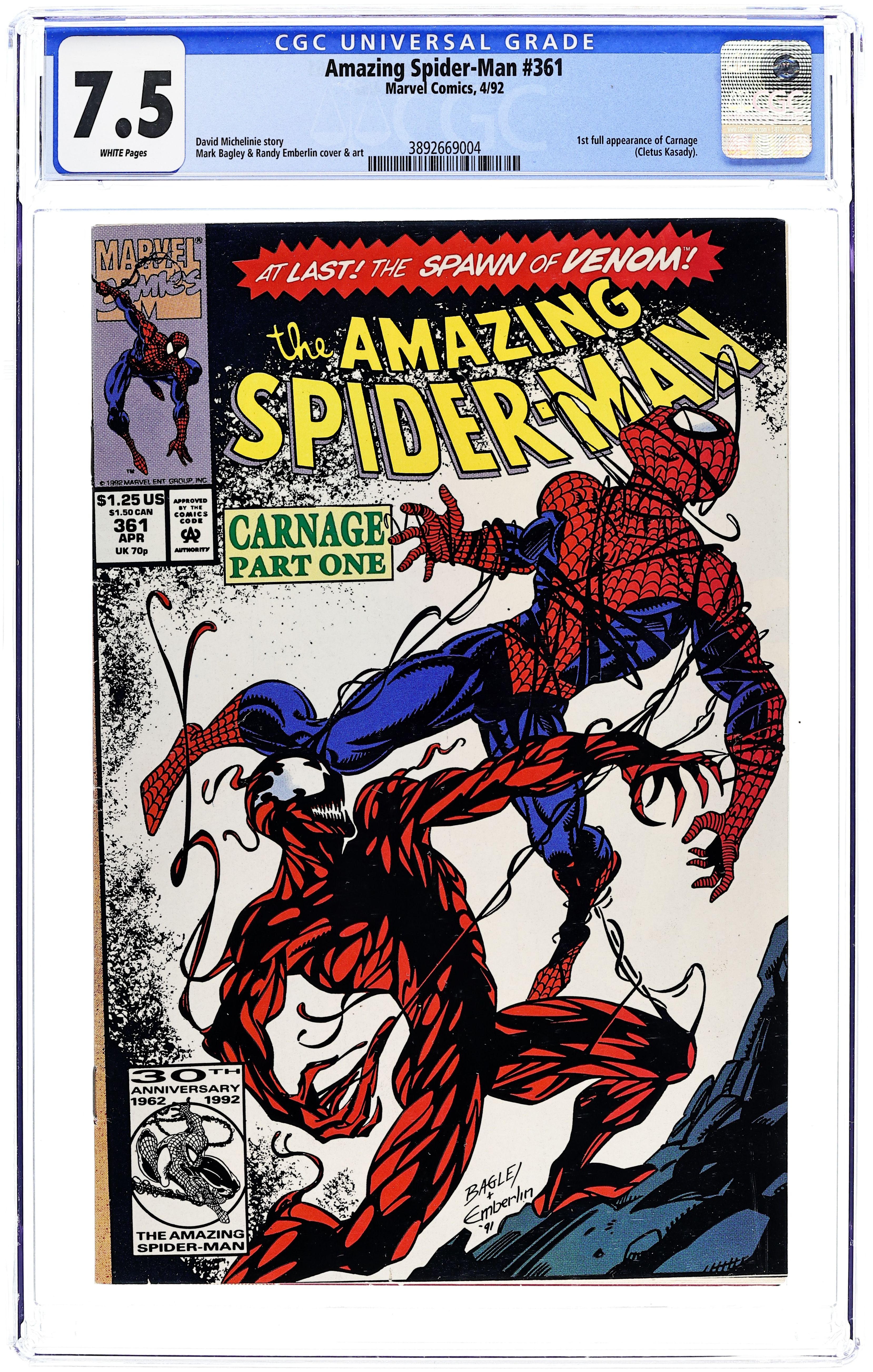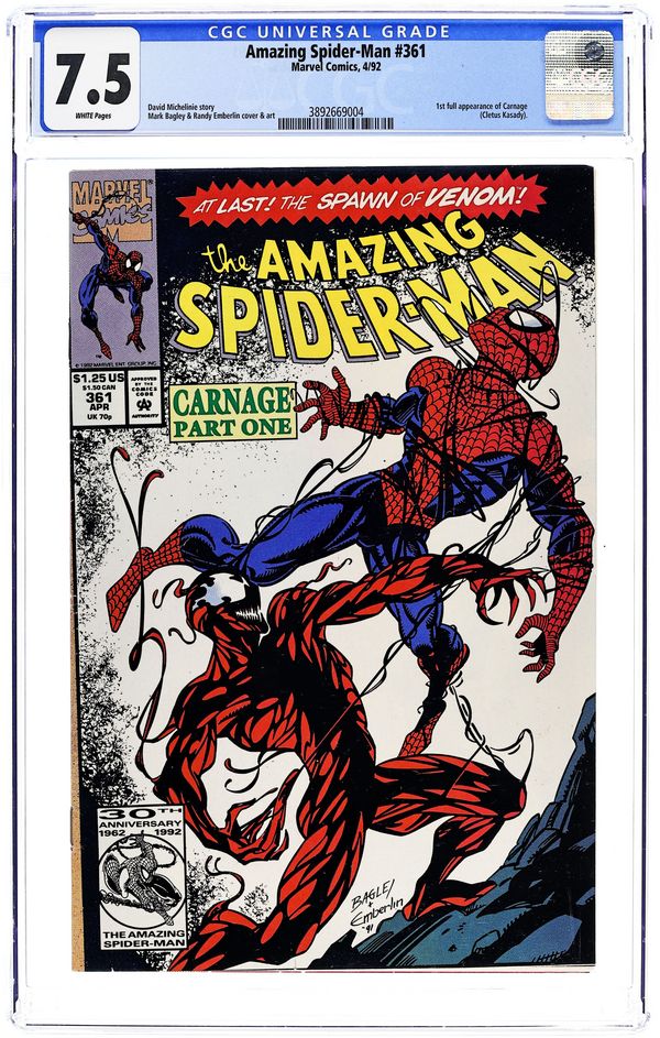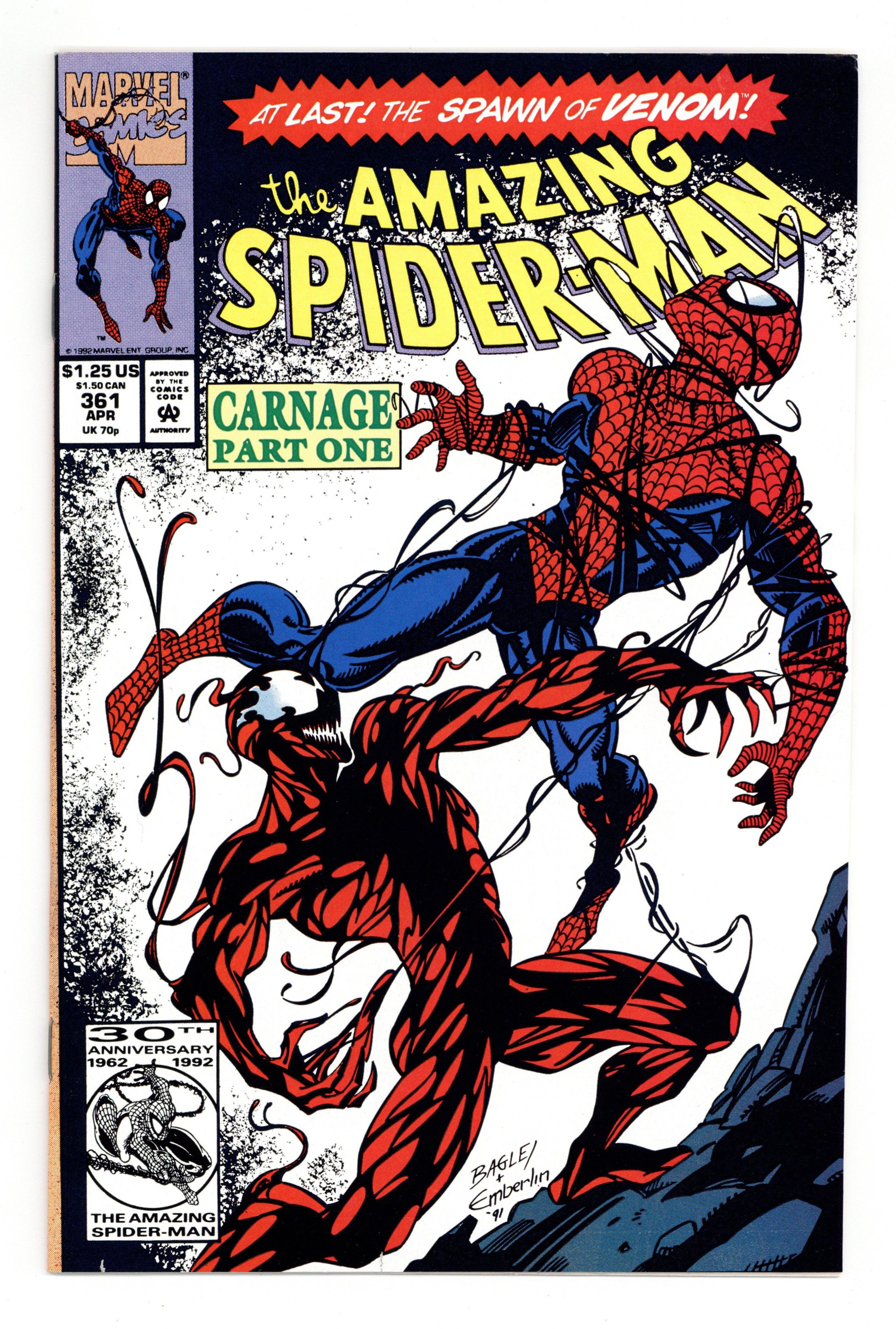 Tags: Marvel Legacy Numbering: Amazing Spider-Man (part 361), Spider-Man$73.00First Printing. Direct Edition. First (full) appearance of Carnage in "Savage Genesis!" Part 1 of 3. Script by David Michelinie. Pencils by Mark Bagley. Inks by Randy Emberlin. Cover by Mark Bagley and Randy Emberlin. Blood runs in the streets as a serial killer roams New York City! And as the web-slinger investigates the murders, he notices a very disturbing similarity to another killer's modus operandi! In a burned-out building in Brooklyn, the spectacular one comes face-to-face with his new homicidal foe...Carnage! Can the wall-crawler end Cletus Kasady's rampage in their very first encounter? Cameo appearances by Aunt May and Mary Jane Watson. Flashback cameo by Venom. (Note: This three-part story was reprinted in 2011 in the trade paperback: Spider-Man -- The Vengeance of Venom.) 36 pages, full color. $1.25 cover price. NOTE: Most of these were distributed with slight printer tears in the bottom edge of the cover. Cover price $1.25.