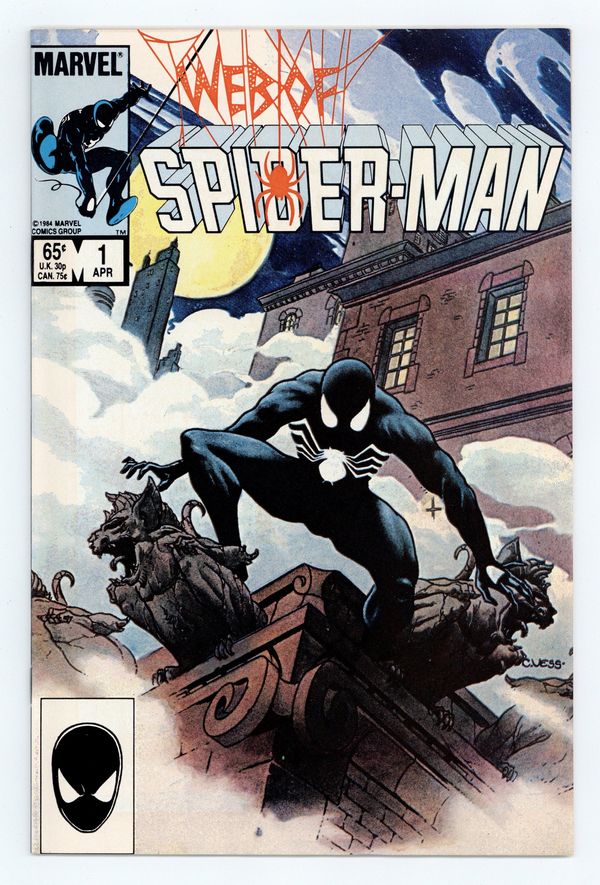 Tags: Spider-Man$29.50Direct Edition. "Til Death Do Us Part!" Story by Louise Simonson. Art by Greg LaRocque and Jim Mooney. Painted cover by Charles Vess. The alien symbiote (aka black costume) ambushes Peter Parker while he is getting dressed. Now Spider-Man must battle the black costume and the new Vulturions on his way to the Baxter Building! Meanwhile, Aunt May laments Peter's decision to drop out of graduate school. (Note: The Web of Spiderman series essentially replaced the Marvel Team-Up title as Marvel's third regular series featuring Spider-Man.) 32 pages Cover price $0.65.