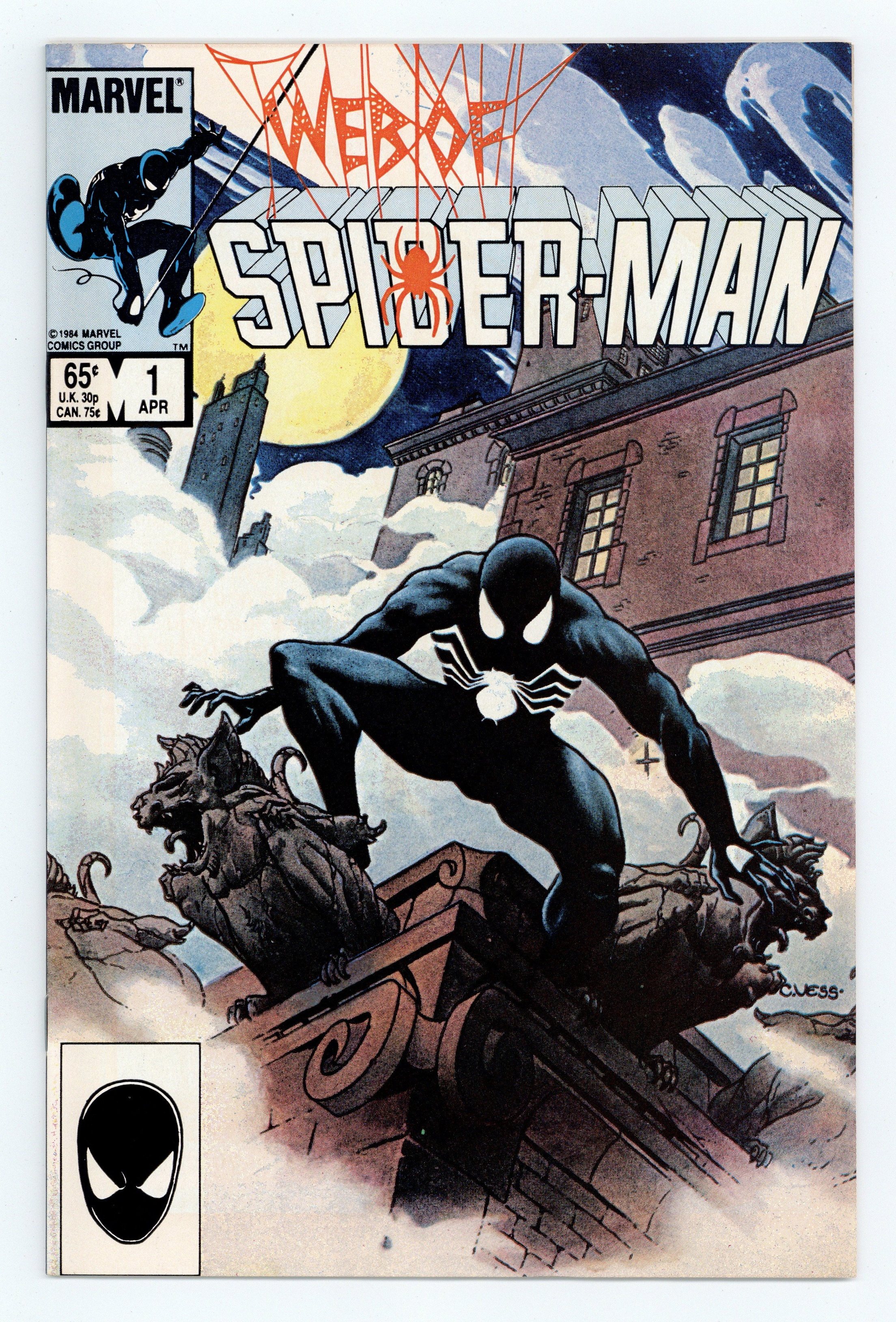 Direct Edition. "Til Death Do Us Part!" Story by Louise Simonson. Art by Greg LaRocque and Jim Mooney. Painted cover by Charles Vess. The alien symbiote (aka black costume) ambushes Peter Parker while he is getting dressed. Now Spider-Man must battle the black costume and the new Vulturions on his way to the Baxter Building! Meanwhile, Aunt May laments Peter's decision to drop out of graduate school. (Note: The Web of Spiderman series essentially replaced the Marvel Team-Up title as Marvel's third regular series featuring Spider-Man.) 32 pages Cover price $0.65.