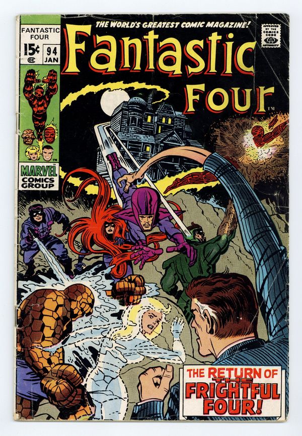 Tags: Fantastic Four$81.00"The Return of the Frightful Four!" First appearance of Agatha Harkness. Script by Stan Lee. Pencils by Jack Kirby. Inks by Joe Sinnott. Cover by Jack Kirby and John Verpoorten. The Fantastic Four joyfully reunite at the Baxter Building following Ben's wild adventure against the gangster skrulls last issue. And the first order of business is finding a nanny for Reed and Sue's new baby! Based upon an excellent recommendation, the FF fly to Whisper Hill to meet Agatha Harkness. Will Agatha be able to care for and protect little Franklin in her supernatural home? The fabulous foursome will know soon enough…once the Frightful Four attack! Look out! After the Wizard, Sandman, and Trapster subdue the FF and Medusa, just an old lady and her pet cat stand in their way of victory! The three super-villains should finish off Agatha and Ebony easily, but sometimes appearances can be deceiving…very deceiving! Cameo appearance by Crystal. (Notes: In this story Reed and Sue announce their baby's name…Franklin Benjamin Richards. The Frightful Four battle the FF again in Fantastic Four 129. This issue includes a full-page ad for Avengers 71 and Thor 171. This issue was reprinted in Marvel Treasury Edition 11.) 36 pages Cover price $0.15.