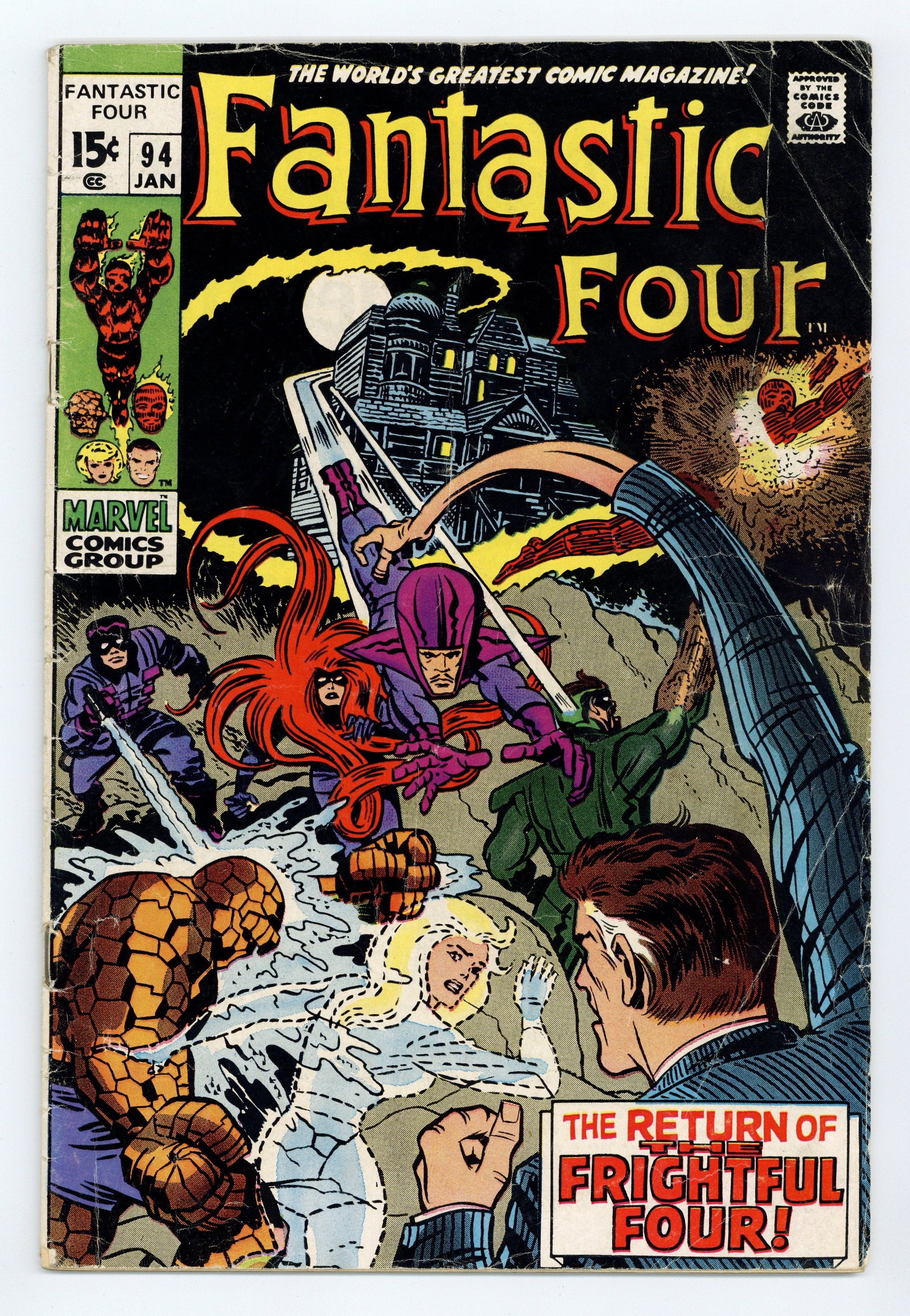 "The Return of the Frightful Four!" First appearance of Agatha Harkness. Script by Stan Lee. Pencils by Jack Kirby. Inks by Joe Sinnott. Cover by Jack Kirby and John Verpoorten. The Fantastic Four joyfully reunite at the Baxter Building following Ben's wild adventure against the gangster skrulls last issue. And the first order of business is finding a nanny for Reed and Sue's new baby! Based upon an excellent recommendation, the FF fly to Whisper Hill to meet Agatha Harkness. Will Agatha be able to care for and protect little Franklin in her supernatural home? The fabulous foursome will know soon enough…once the Frightful Four attack! Look out! After the Wizard, Sandman, and Trapster subdue the FF and Medusa, just an old lady and her pet cat stand in their way of victory! The three super-villains should finish off Agatha and Ebony easily, but sometimes appearances can be deceiving…very deceiving! Cameo appearance by Crystal. (Notes: In this story Reed and Sue announce their baby's name…Franklin Benjamin Richards. The Frightful Four battle the FF again in Fantastic Four 129. This issue includes a full-page ad for Avengers 71 and Thor 171. This issue was reprinted in Marvel Treasury Edition 11.) 36 pages Cover price $0.15.