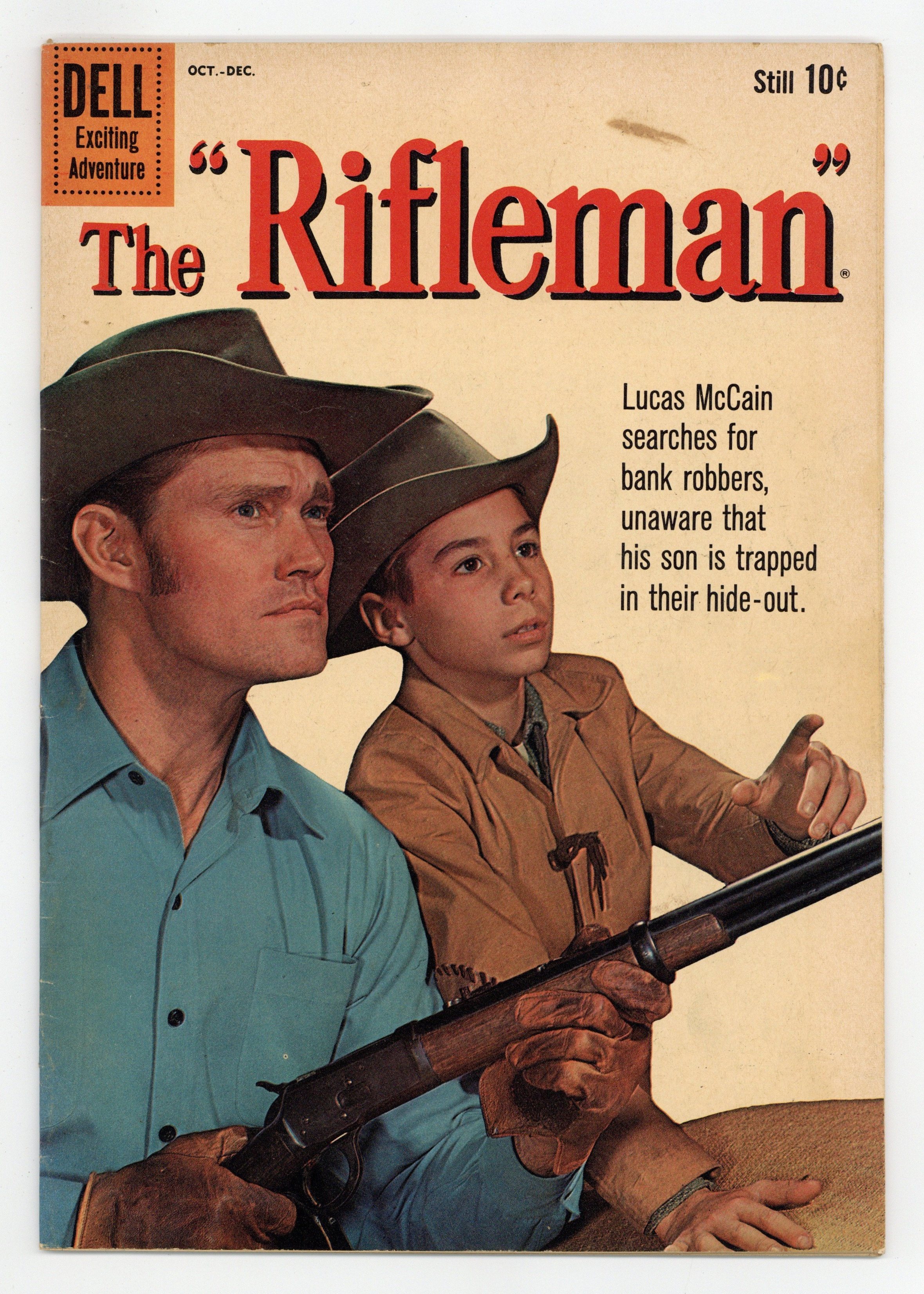 Cover photo of Chuck Connors and Johnny Crawford. Stories and art by Warren Tufts and others. Rifle-toting rancher Lucas McCain helps keep order in the Old West, based on the popular TV Western. While Lucas is helping Marshal Torrance track down a gang of bank robbers, Mark and a friend are trapped in the outlaws' hideout, trying to signal for help. A mountain man causes chaos in North Forks when he comes into town for a night of debauchery. But the matter turns more serious when Lucas discovers a revenge plot against the mountain man. Ghost Town Raid; A Matter of Fractions; Ranch Boy; Mountain Giant; The Thief; Men of the Mountains; Exposed to Danger. 32 pages, Full Color. Cover price $0.10.
