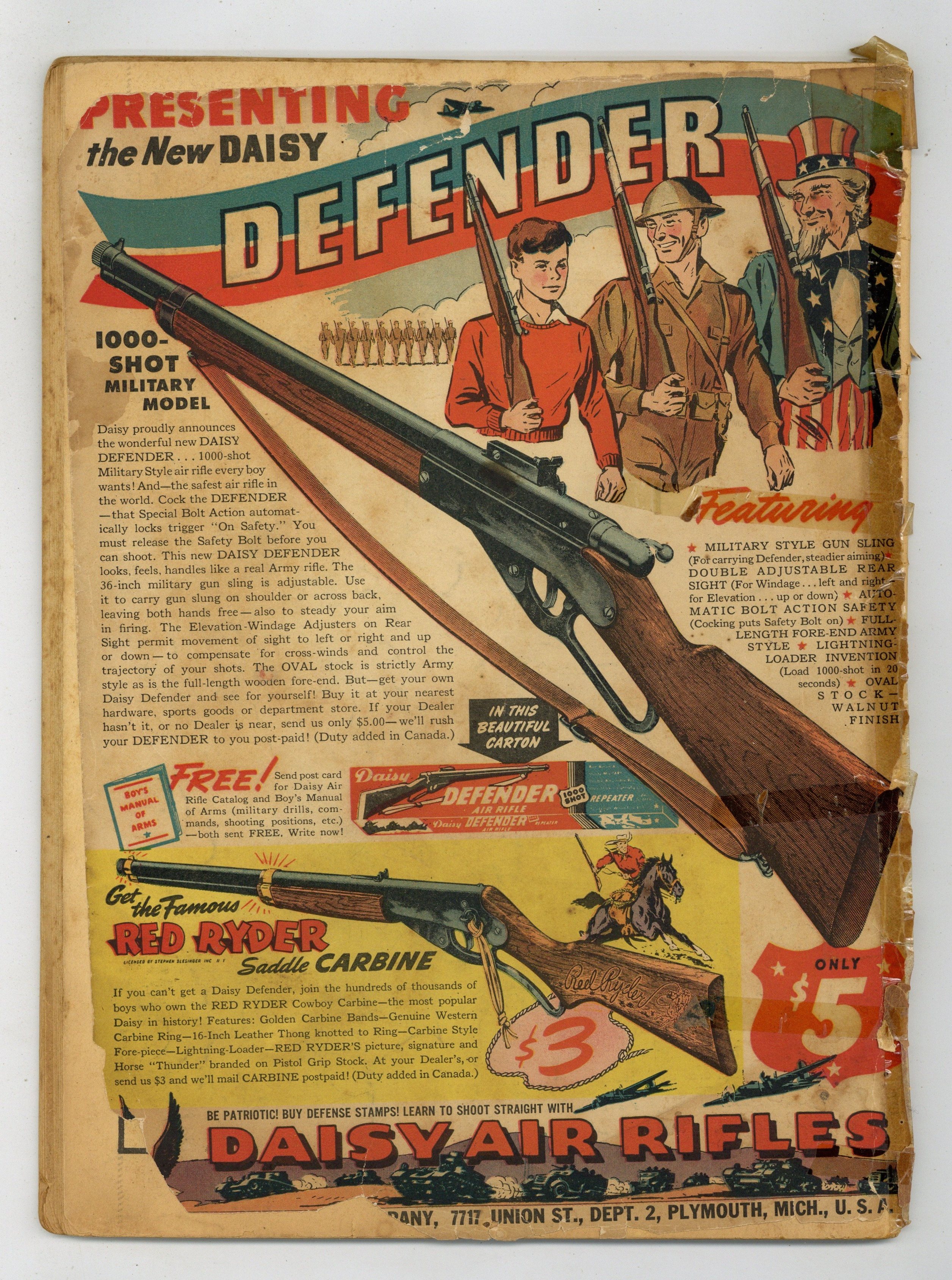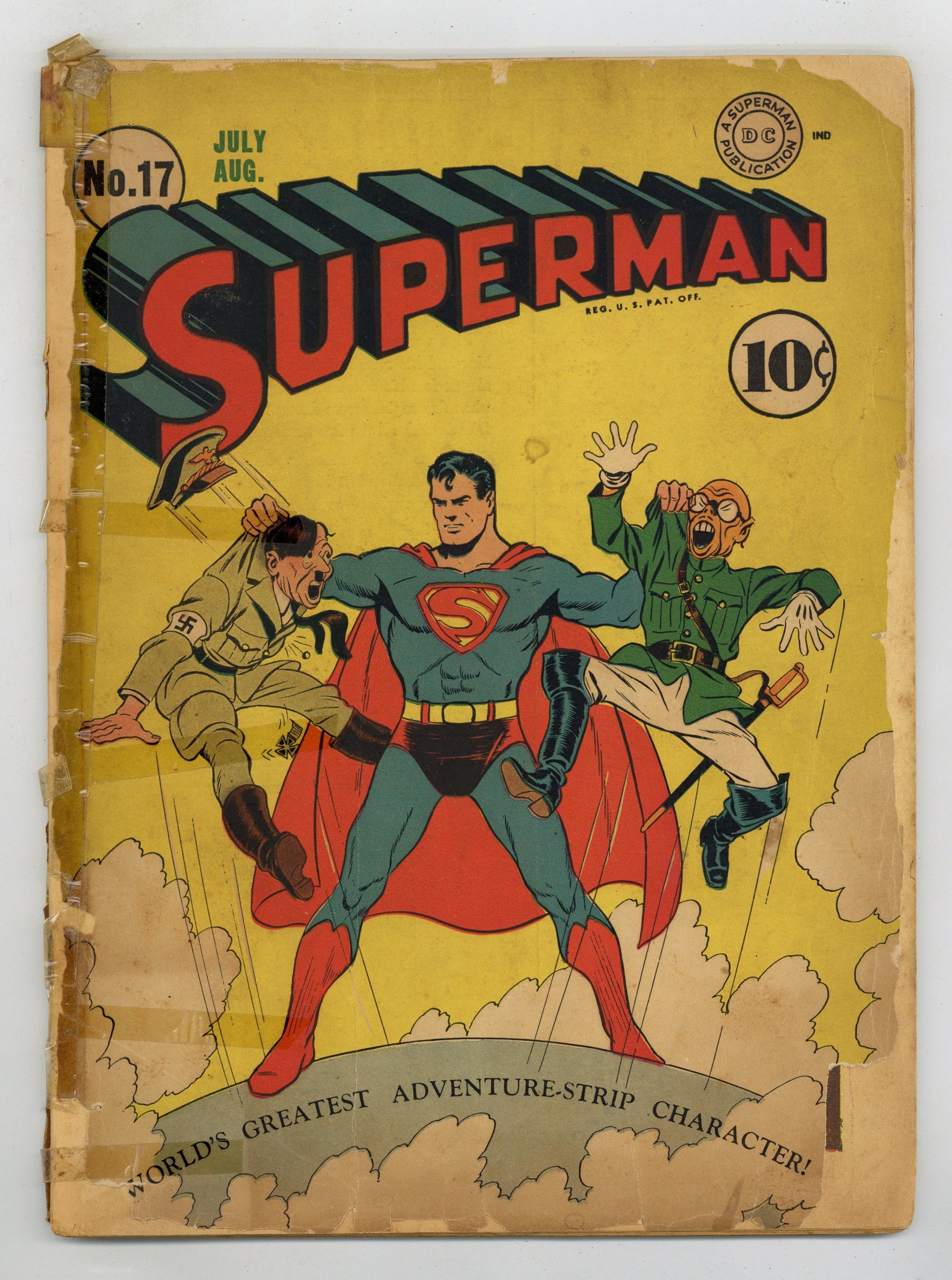 Cover art by Fred Ray, features Hitler and Hirohito. Man Or Superman?, script by Jerry Siegel, pencils by Joe Shuster, inks by John Sikela [as Shuster]; Lois suspects that Clark Kent is Superman. The Human Bomb, script by Jerry Siegel, art by Leo Nowak [as Joe Shuster]; A vicious criminal uses innocent people, trapped by hypnotic power, who are armed with a bomb apparatus which makes it possible for them to rob without opposition from the Police. G-Man humor two-pager by Ray McGill. Muscles For Sale, script by Jerry Siegel, art by John Sikela [as Joe Shuster]; Superman must solve a series of bold crimes that were pulled by ungainly men who look anything but formidable. Rollin' Stone humor two-pager by Ray McGill. When Titans Clash, script by Jerry Siegel, art by John Sikela [as Joe Shuster]; Lex Luthor survives his execution in the electric chair, which only makes him more powerful. Full-page ad for Action Comics # 43/World's Finest # 6. 68 Pages, Full Color. Cover price $0.10.