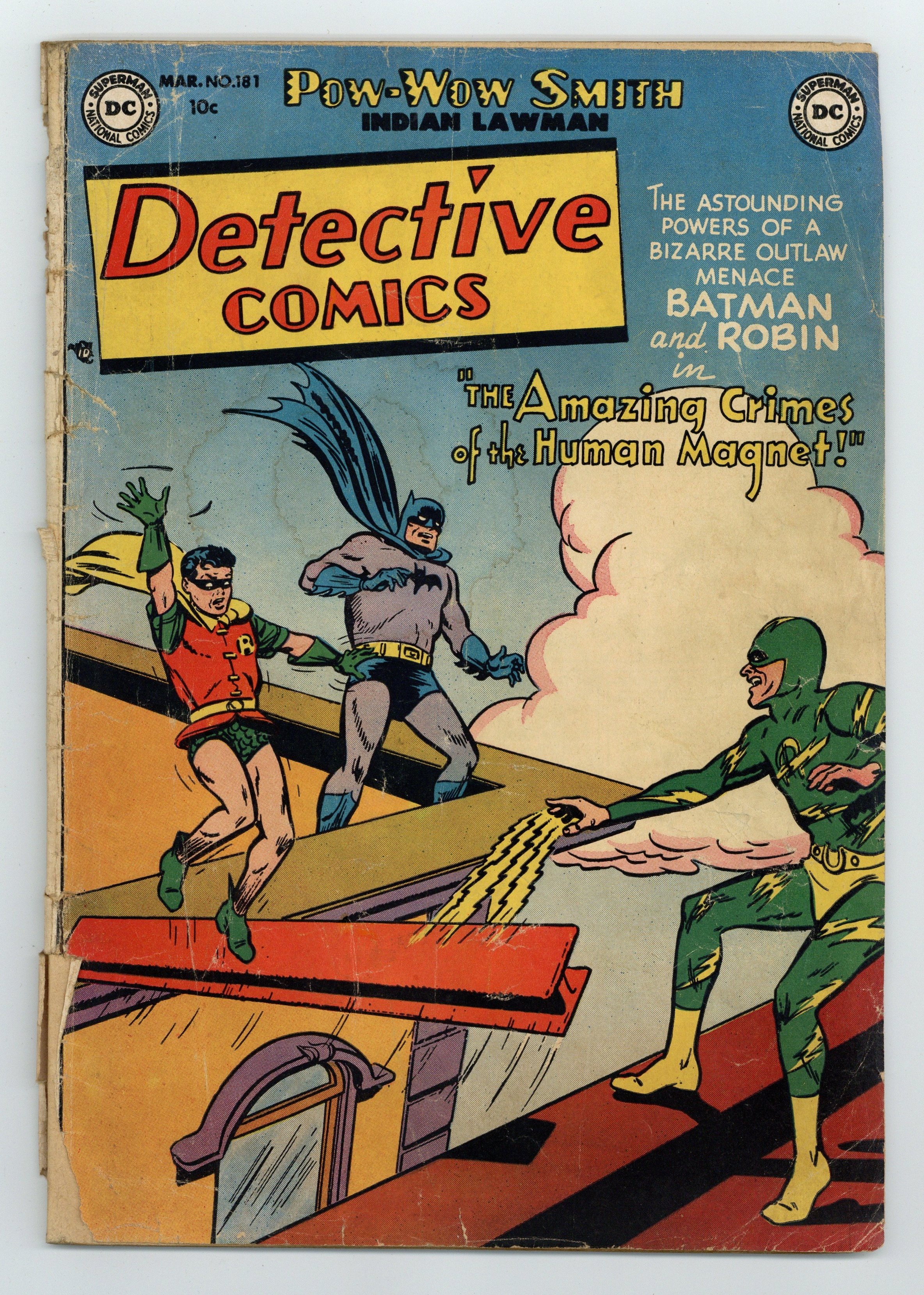 Cover by Win Mortimer. Stories by unknown. Art by Jim Mooney, Charles Paris, Leonard Starr, Ruben Moreira and unknown. The astounding powers of a bizarre outlaw menace Batman and Robin in "The Crimes of the Human Magnet!" with art by Jim Mooney and Charles Paris. Plus: Pow-Wow Smith, Indian Lawman in "Pow-Wow Smith, Medicine Man!" with art by Leonard Starr; Robotman in "The Safest Safe in the World!"; and Impossible -- But True! tale "Roy Raymond's Perfect Double" (featuring Roy Raymond) with art by Ruben Moreira. Also: Casey the Cop 1-pager by Henry Boltinoff; Jerry the Jitterbug 1-pager by Boltinoff; 2-page text piece "How Forgers Are Caught" by David Kahn; and Peg half-pager by Boltinoff. 44 pages, full color. Cover price $0.10.
