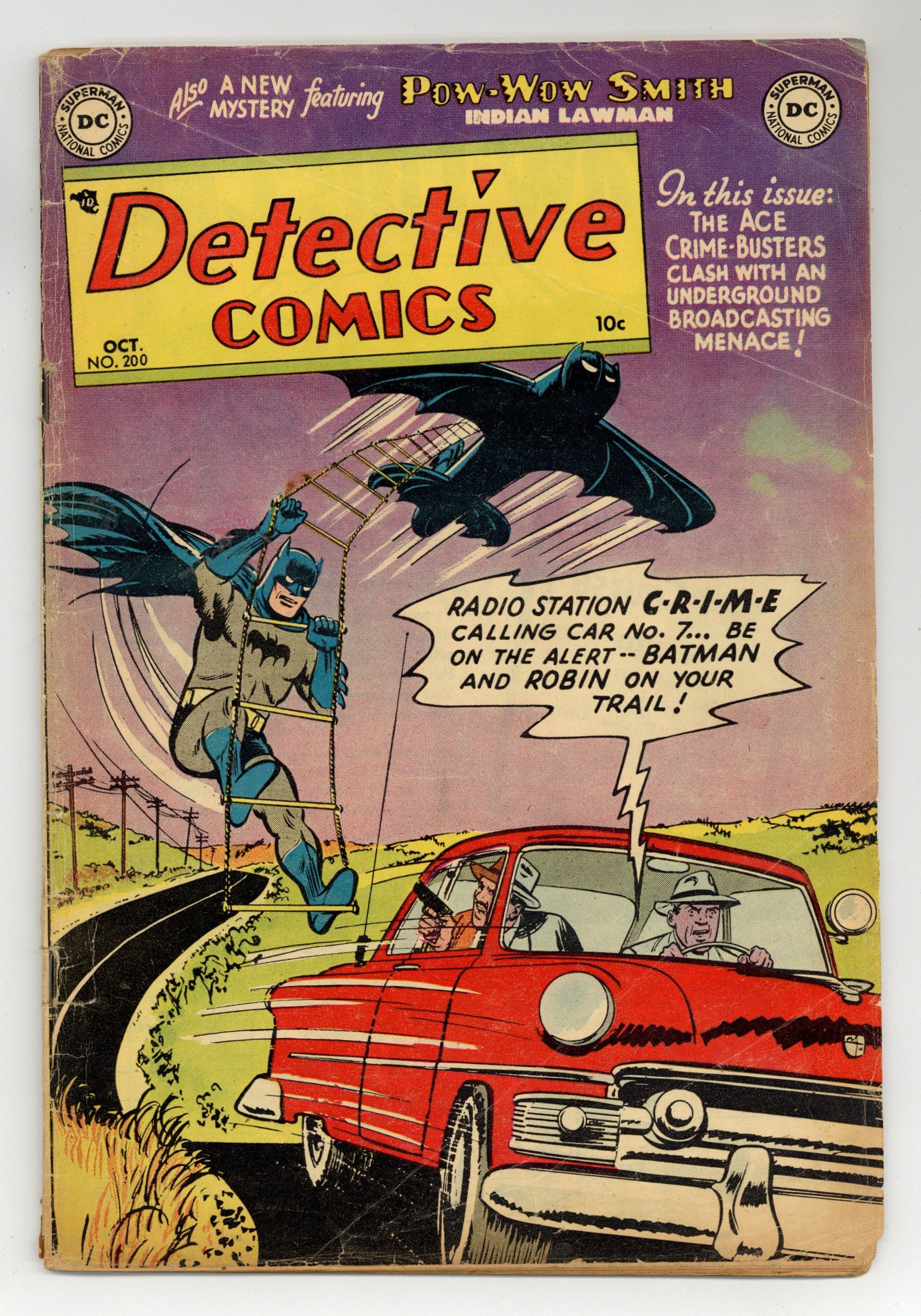 Cover by Win Mortimer. Stories by unknown. Art by Lew Sayre Schwartz, Charles Paris, Leonard Starr, Joe Certa and Ruben Moreira. Batman and Robin clash with an underground broadcasting menace in "Radio Station C-R-I-M-E!" with art by Lew Sayre Schwartz and Charles Paris. Plus: Pow-Wow Smith, Indian Lawman in "The Unwilling...Witness!" with art by Leonard Starr; Robotman in "Superstitious Robot!" with art by Joe Certa; and Impossible -- But True! tale "The Maker of Mental Giants!" (featuring Roy Raymond) with art by Ruben Moreira. Also: Casey the Cop half-pager by Henry Boltinoff; Peg 1-pager by Boltinoff; and 2-page text piece "Calling All Cars!" by Jack Miller. 44 pages, full color. Cover price $0.10.