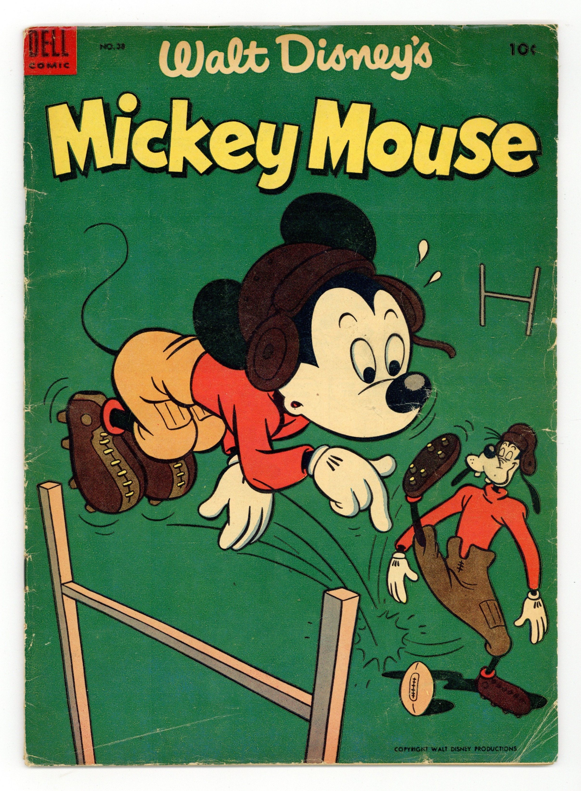 #38 10-11/1954, 10c. Mickey Mouse and Goofy in an untitled story in which they help the town of Gopher Gulch which is being terrorized by Black Pete, "Mystery at Owl Rock" in which Mickey and Goofy try to solve the mystery of a deserted Indian village, and "Burned Up. Issue also has one-page gag strips on back cover and throughout book. Story and art credits: unknown. 36 pages, full color. Cover price $0.10.
