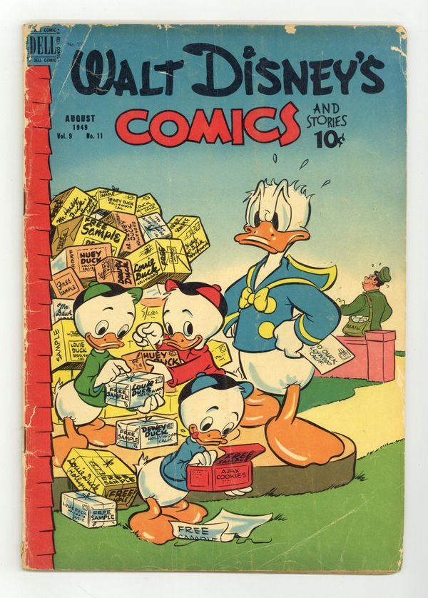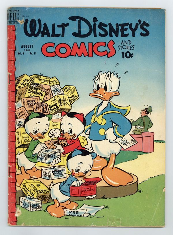 Tags: Disney Ducks & MicePublished Aug 1949 by Dell/Gold Key.$22.50Cover by Al Taliaferro. Stories and art by Carl Barks, Floyd Gottfredson, Bill Walsh, Dick Moores, Bob Karp, Merrill De Maris, Tony Strobl, Gil Turner, George Waiss, Bill Wright, Manuel Gonzales, and Al Taliaferro. Sometimes listed as Vol. 9 #11. The long-running vehicle for Disney character comics featured work by Carl Barks, Floyd Gottfredson, and Pogo's Walt Kelly. In a classic story from the Mickey Mouse comic strip, ghost-hunters Mickey, Goofy and Donald are hired by Colonel Bassett to investigate the House of Seven Haunts. In a story by Barks, a lab accident gives Donald superpowers. Mickey meets his great-grandfather Ablemarle, a dancing, cattle-thieving, swindling, jaywalking live wire. Donald Duck; Bucky Bug; Li'l Bad Wolf; Mickey Mouse; Dumbo the Flying Elephant; Danny Saves the Day; Mickey Mouse in the House of Seven Haunts. 48 pages, Full Color. Cover price $0.10.