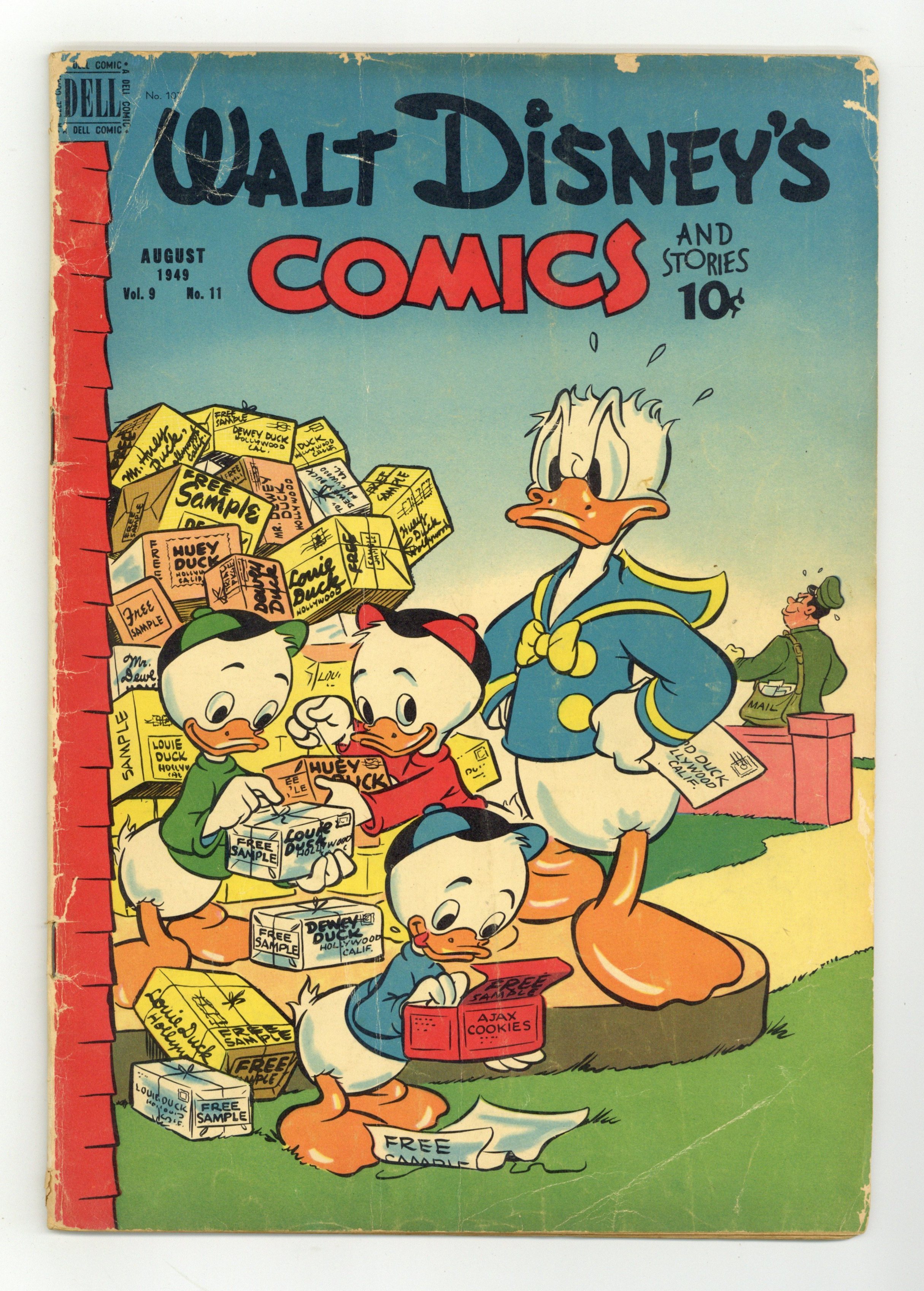 Cover by Al Taliaferro. Stories and art by Carl Barks, Floyd Gottfredson, Bill Walsh, Dick Moores, Bob Karp, Merrill De Maris, Tony Strobl, Gil Turner, George Waiss, Bill Wright, Manuel Gonzales, and Al Taliaferro. Sometimes listed as Vol. 9 #11. The long-running vehicle for Disney character comics featured work by Carl Barks, Floyd Gottfredson, and Pogo's Walt Kelly. In a classic story from the Mickey Mouse comic strip, ghost-hunters Mickey, Goofy and Donald are hired by Colonel Bassett to investigate the House of Seven Haunts. In a story by Barks, a lab accident gives Donald superpowers. Mickey meets his great-grandfather Ablemarle, a dancing, cattle-thieving, swindling, jaywalking live wire. Donald Duck; Bucky Bug; Li'l Bad Wolf; Mickey Mouse; Dumbo the Flying Elephant; Danny Saves the Day; Mickey Mouse in the House of Seven Haunts. 48 pages, Full Color. Cover price $0.10.