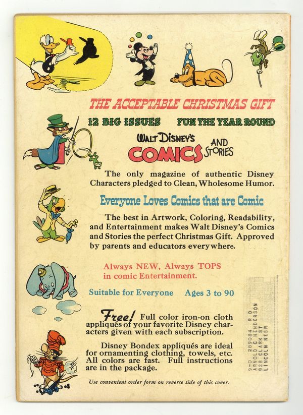 Cover by Walt Kelly. Stories and art by Carl Barks, Floyd Gottfredson, Bill Walsh, Dick Moores, Bob Karp, Ted Osborne, Gil Turner, Tony Strobl, George Waiss, Bill Wright, and Al Taliaferro. Sometimes listed as Vol. 10 #4. The long-running vehicle for Disney character comics featured work by Carl Barks, Floyd Gottfredson, and Pogo's Walt Kelly. In a classic story from the Mickey Mouse comic strip, when Clarabelle vanishes from a tour of a north woods lumber camp, Mickey goes looking for her. In a story by Barks, Donald's nephews convince him that he's been asleep for forty years. Mickey tries to run Clarabelle's pet store. Donald Duck; Bucky Bug; Li'l Bad Wolf; Mickey Mouse; Christmas Magic; Mickey Mouse in the Mystery at Hidden River. 48 pages, Full Color. Cover price $0.10.