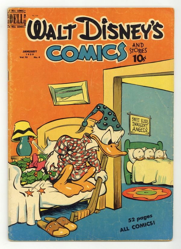 Tags: Disney Ducks & MicePublished Jan 1950 by Dell/Gold Key.$33.50Cover by Walt Kelly. Stories and art by Carl Barks, Floyd Gottfredson, Bill Walsh, Dick Moores, Bob Karp, Ted Osborne, Gil Turner, Tony Strobl, George Waiss, Bill Wright, and Al Taliaferro. Sometimes listed as Vol. 10 #4. The long-running vehicle for Disney character comics featured work by Carl Barks, Floyd Gottfredson, and Pogo's Walt Kelly. In a classic story from the Mickey Mouse comic strip, when Clarabelle vanishes from a tour of a north woods lumber camp, Mickey goes looking for her. In a story by Barks, Donald's nephews convince him that he's been asleep for forty years. Mickey tries to run Clarabelle's pet store. Donald Duck; Bucky Bug; Li'l Bad Wolf; Mickey Mouse; Christmas Magic; Mickey Mouse in the Mystery at Hidden River. 48 pages, Full Color. Cover price $0.10.
