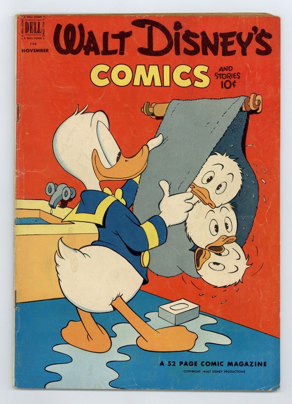 Cover by Carl Barks. Stories and art by Carl Barks, Merrill De Maris, Bill Wright, Bill Walsh, Manuel Gonzales, Bob Karp, Don Christensen, Frank McSavage, Gil Turner, and Al Taliaferro. Sometimes listed as Vol. 13 #2. The long-running vehicle for Disney character comics featured art by Carl Barks, the legendary Good Duck Artist. Mickey Mouse frees a genie. In a story by Barks, Donald's new scheme to raise chickens doesn't work out as planned. Mickey takes in Goofy's new pet, which turns out to be a camel. Donald Duck; Li'l Bad Wolf; Pluto; Little Hiawatha; Halloween Ghost; Mickey Mouse: The Miracle Master. 48 pages, Full Color. Cover price $0.10.