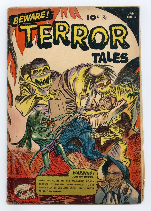 Cover by Bernard Bailey. Stories and art by Sheldon Moldoff, Bill Woolfolk, Maurice Gutwirth and Bob McCarthy. Classic pre-Code horror from St. John. A police detective encounters a magical clock that sends people to Hell when it strikes thirteen. Traveling the polar wastes, two explorers are trapped in an igloo for months, and one of them is slowly going insane... or is it both? Gangsters force a Romani witch to use her powers to bring a ganglord back from the dead. The Horrors of the 13th Stroke; The Lonely One!; The Ghoul at Eldritch Manor!; Gray Matter; Return of the Dead! 32 pages, Full Color. Cover price $0.10.