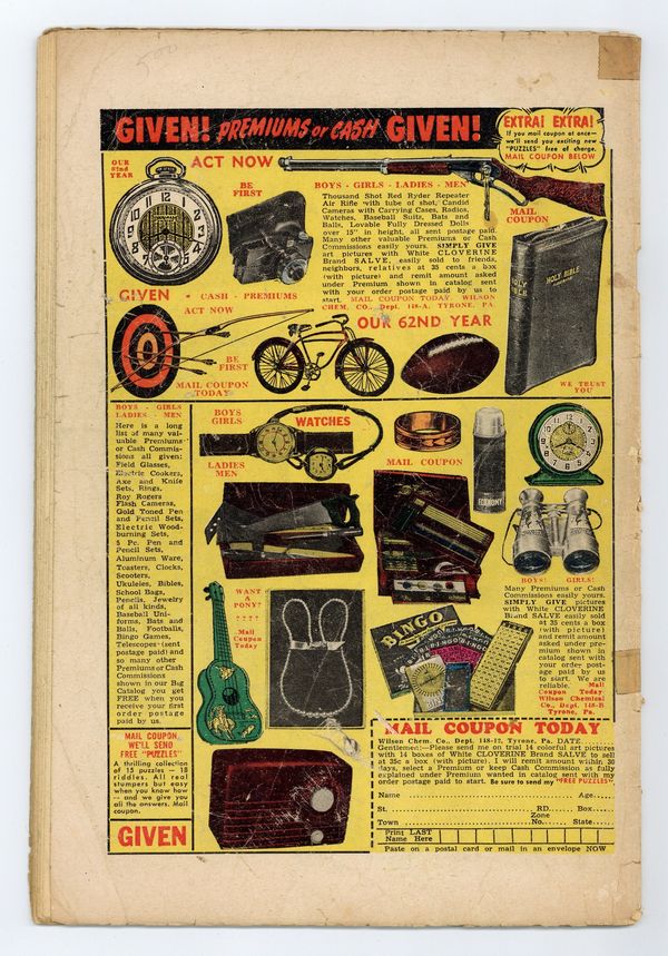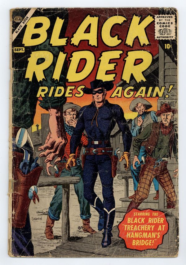 The Black Rider stars in "The Legend of the Black Rider," "Duel at Dawn," and "Treachery at Hangman's Bridge" (all with pencils by Jack Kirby). Also in this issue: "The Empty Saddle" (art by Bob Powell). Gene Colan text illustration. John Severin cover. Cover price $0.10.