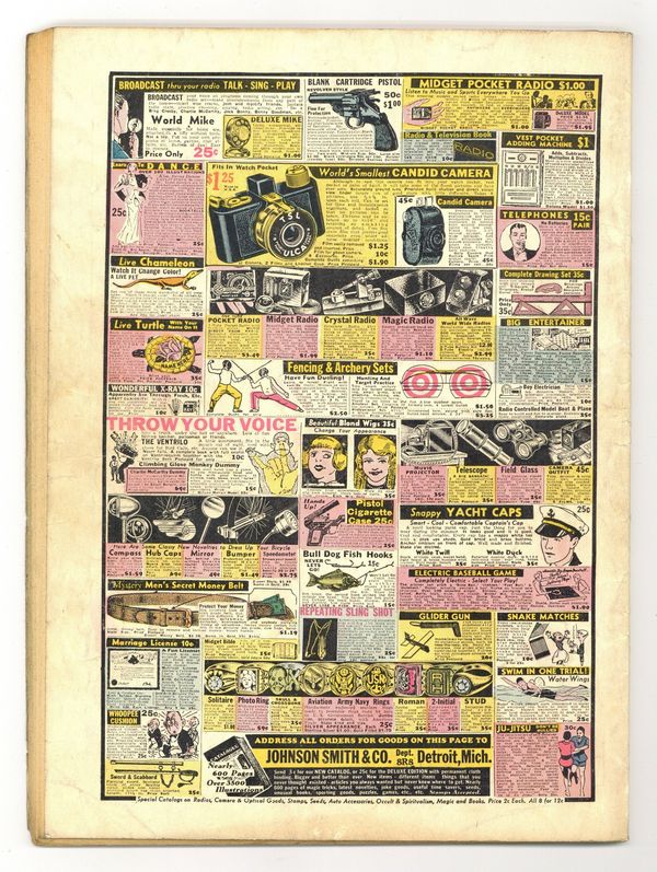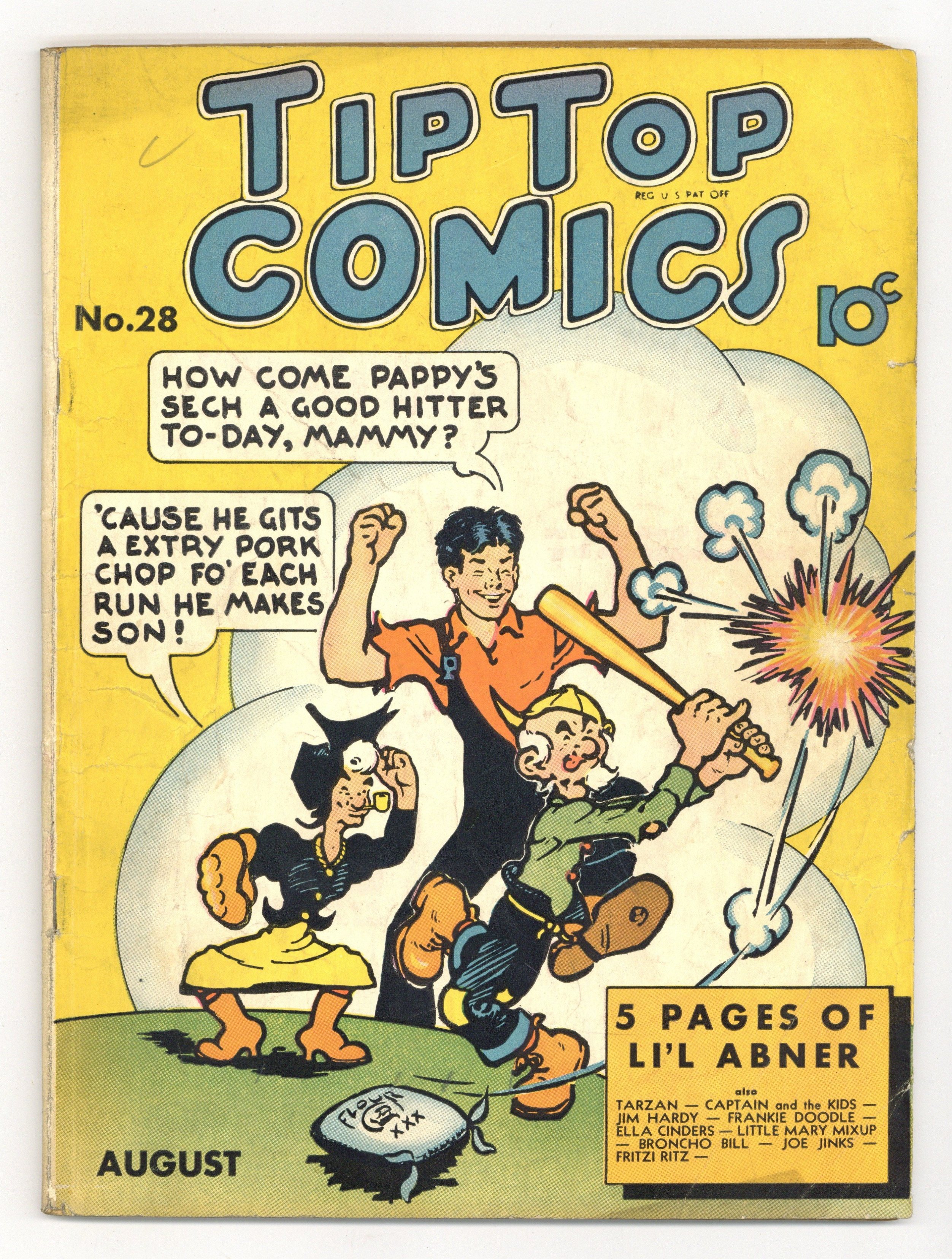 Stories and art by Hal Foster, Al Capp, Ernie Bushmiller, Bill Conselman, Charlie Plumb, Rudolph Dirks, Gus Mager, Dick Moores, Paul Berdanier, Harry O'Neill, Fred Methot, Alan Maver, Ed Dodd, J. Carver Pusey, R. M. Brinkerhoff, Robert Dickey, and Ben Batsford. Sometimes listed as Tip Top Comics Vol. 3 #4. Tip Top Comics presented color reprints of United Features newspaper comic strips. Tarzan is knighted by Sigreda, now queen of the lost Viking tribe, in Tarzan Sunday strips with art by Hal Foster. But then she wishes to marry Tarzan, which angers his friend Thorik. Jim Hardy must stop Nancy from marrying his rival after she thinks Jim has fallen for femme fatale Lola. Swami Riva, the great Hindu mystic, visits Dogpatch and accidentally turns Mammy invisible, in a Li'l Abner storyline by Al Capp. Li'l Abner; The Captain and the Kids; Tarzan of the Apes; Jim Hardy; The Volcano Vulture; Net Results; Bumps; Divot Diggers; Broncho Bill; Stamp Tips; Opportunity Knox; Benny; Home Towners; Frankie Doodle; Bucky and His Pals; Buster Beans; Hawkshaw the Detective; How It Began; Tip Top Cartoon Club; Phil Fumble; Fritzi Ritz; Twice Told Tales; Joe Jinks Featuring Dynamite Dunn; Little Mary Mixup; Ella Cinders; Chris Crusty. 64 pages, Full Color. Cover price $0.10.