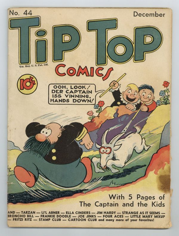 Cover by Rudolph Dirks. Stories and art by Rex Maxon, Al Capp, Ernie Bushmiller, Bill Conselman, Charlie Plumb, Rudolph Dirks, Gus Mager, Dick Moores, Paul Berdanier, Harry O'Neill, Fred Methot, Alan Maver, Ed Dodd, J. Carver Pusey, R. M. Brinkerhoff, Robert Dickey, John Hix and Ben Batsford. Sometimes listed as Tip Top Comics Vol. 4 #8. Tip Top Comics presented color reprints of United Features newspaper comic strips. Tarzan reunites Bob and Mary with their father, but the pirates aren't beaten yet, in Tarzan Sunday strips with art by Rex Maxon. Jim Hardy learns that young Bill has run away because he blames himself for losing the briefcase with the million-dollar invention. Fritzi tries to rein in Nancy's shenanigans, in very early strips by Ernie Bushmiller. Plus a Li'l Abner storyline by Al Capp. Li'l Abner; The Captain and the Kids; Tarzan of the Apes; Jim Hardy; Candid Camera Casey; Bumps; Divot Diggers; Broncho Bill; Stamp Tips; Strange as It Seems; Benny; Home Towners; Frankie Doodle; Bucky and His Pals; Buster Beans; Hawkshaw the Detective; How It Began; Tip Top Cartoon Club; Phil Fumble; Fritzi Ritz; Twice Told Tales; Joe Jinks; Little Mary Mixup; Ella Cinders; Chris Crusty. 64 pages, Full Color. Cover price $0.10.
