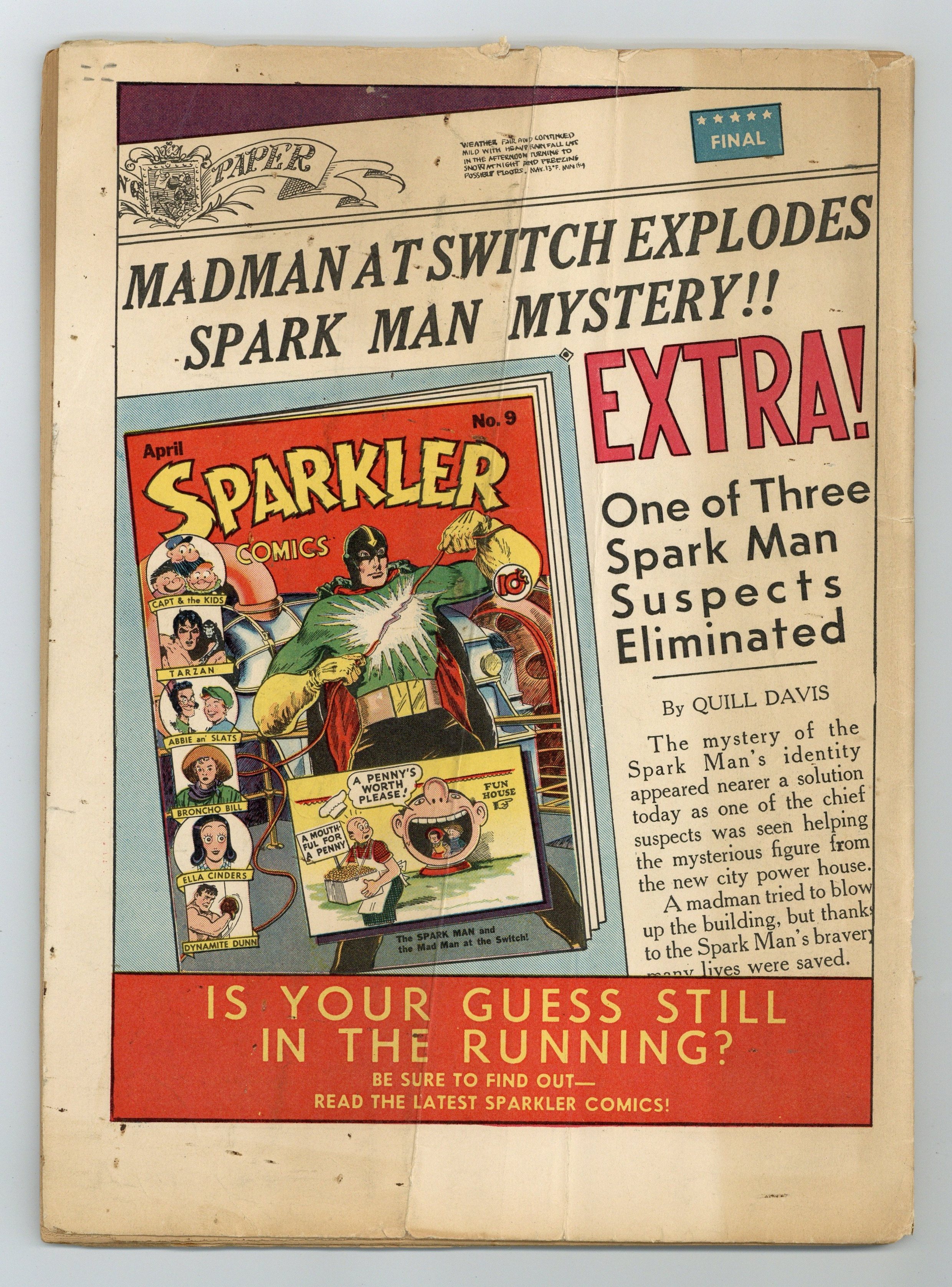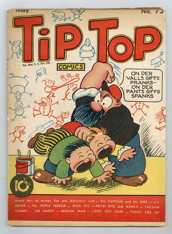 Cover by Rudolph Dirks. Stories and art by Al Capp, Ernie Bushmiller, Rudolph Dirks, Gus Mager, Dick Moores, Fred Methot, Reg Greenwood, Hal Forrest, Bernard Dibble, Ed Dodd and John Hix. Sometimes listed as Tip Top Comics Vol. 7 #1. Tip Top Comics presented color reprints of United Features newspaper comic strips. The Mirror Man is sent to Norway on a US intelligence mission during WWII. Looy Dot Dope and his pal are shanghaied into service on a sinister mystery ship. Iron Vic convinces the manager to put his rookie discovery Ben on the field, but Ben freezes up from anxiety. Plus a Li'l Abner storyline by Al Capp. Li'l Abner; The Captain and the Kids; The Mirror Man; The Triple Terror; Jim Hardy; Stamp Tips; Looy Dot Dope; Tailspin Tommy; Iron Vic; Phil Fumble; Fritzi Ritz; Back Home Again; Strange as It Seems. 64 pages, Full Color. Cover price $0.10.