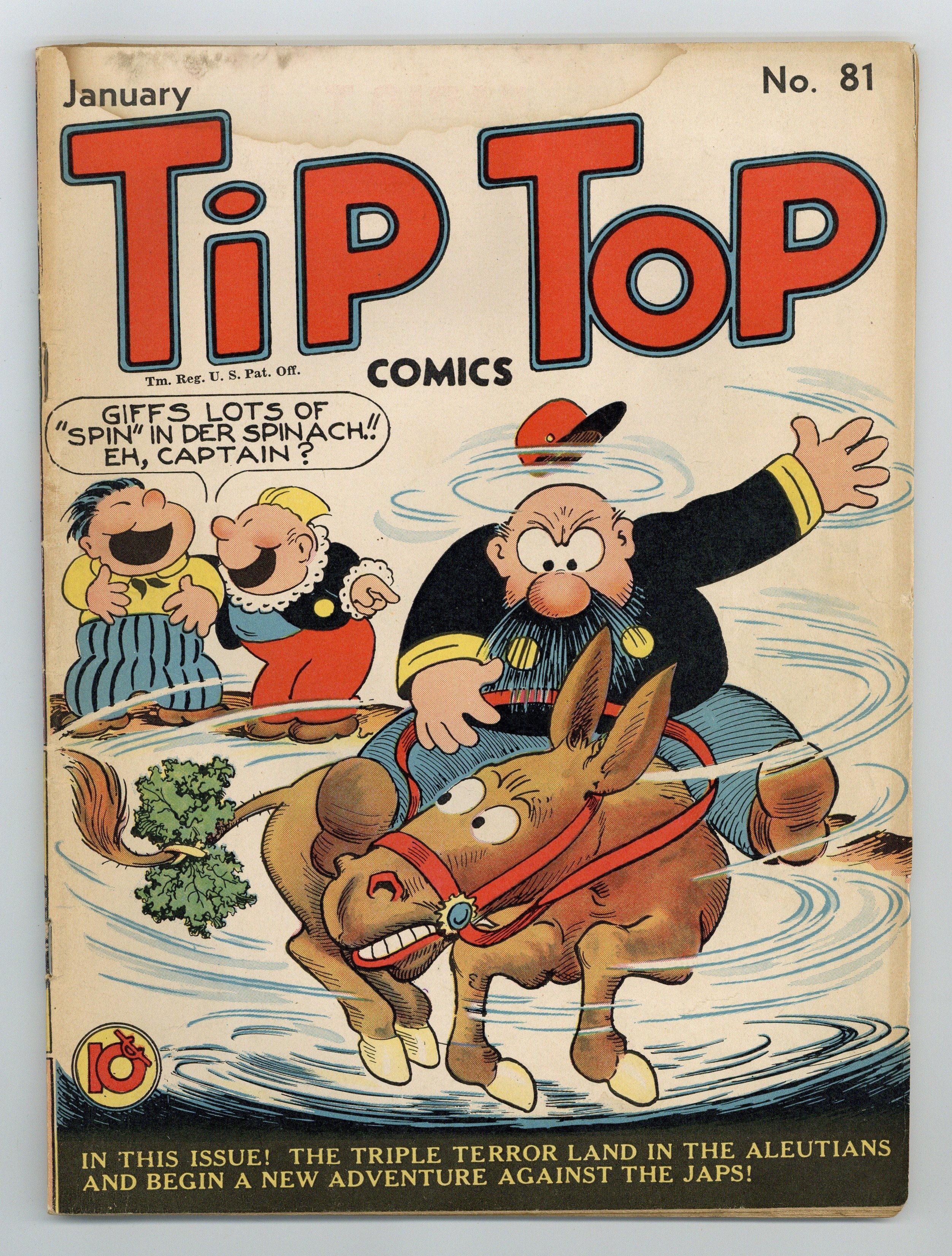 Tags: Comic Strip ReprintsPublished Jan 1943 by United Features Syndicate.$40.00Cover by Rudolph Dirks. Stories and art by Al Capp, Ernie Bushmiller, Rudolph Dirks, Gus Mager, Dick Moores, Fred Methot, Reg Greenwood, Hal Forrest, Bernard Dibble, Ed Dodd and John Hix. Sometimes listed as Tip Top Comics Vol. 7 #9. Tip Top Comics presented color reprints of United Features newspaper comic strips. The Triple Terror superhero team travels to the Aleutians to aid the Allied forces. Phil Fumble is in trouble after Fritzi Ritz catches him with a matchbook from the "Hotfoot Ball Room." Mr. Sniggling looks like a gangster, but he can outshoot any soldier on the Army firing range, including Iron Vic. Plus a Li'l Abner storyline by Al Capp. Li'l Abner; The Captain and the Kids; The Mirror Man; The Triple Terror; Jim Hardy; Stamp Tips; Looy Dot Dope; Tailspin Tommy; Iron Vic; Phil Fumble; Fritzi Ritz; Funny Side Up!; Strange as It Seems; Back Home Again. 64 pages, Full Color. Cover price $0.10.
