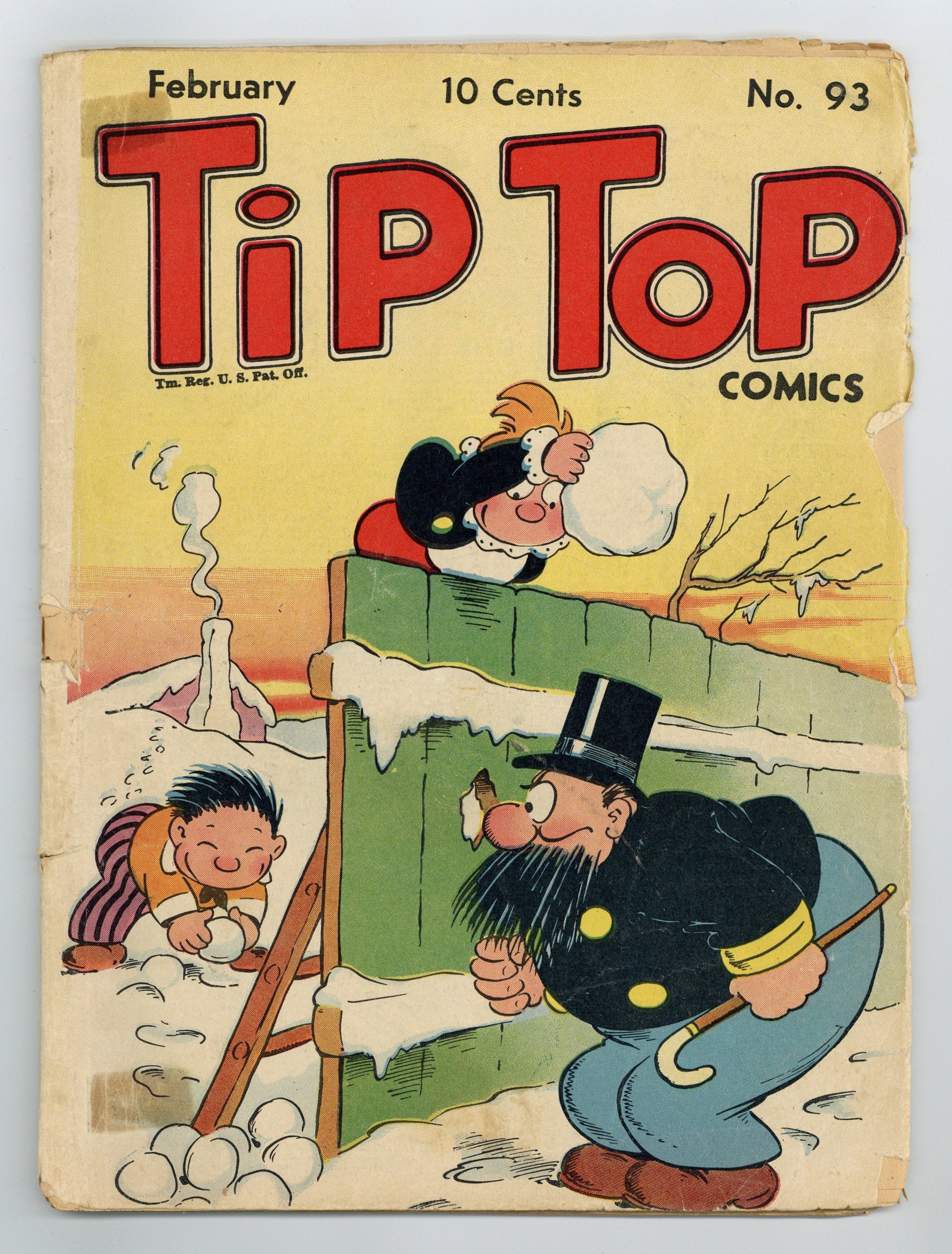 Cover by Rudolph Dirks. Stories and art by Al Capp, Ernie Bushmiller, Rudolph Dirks, Gus Mager, Dick Moores, Fred Methot, Paul Berdanier, Hal Forrest, Bernard Dibble, John Hix and Gus Arriola. Sometimes listed as Tip Top Comics Vol. 8 #9. Tip Top Comics presented color reprints of United Features newspaper comic strips. Superhero team the Triple Terror tries to protect a scientist whose "Owl-flower" formula can allow soldiers to see in the dark. After an encounter with a genie, Bill Bumlin goes to work at a defense plant. Wealthy Cynthia tries to lure Windy away from his real love, Mollie, first with charm, then by telling him his beloved horse Paddles has been kidnapped. Plus a Li'l Abner storyline by Al Capp. Li'l Abner; The Captain and the Kids; The Mirror Man; The Triple Terror; Jim Hardy; Tailspin Tommy; Stamp Tips; Gordo; Bill Bumlin; Phil Fumble; Fritzi Ritz; Strange as It Seems. 56 pages, Full Color. Cover price $0.10.