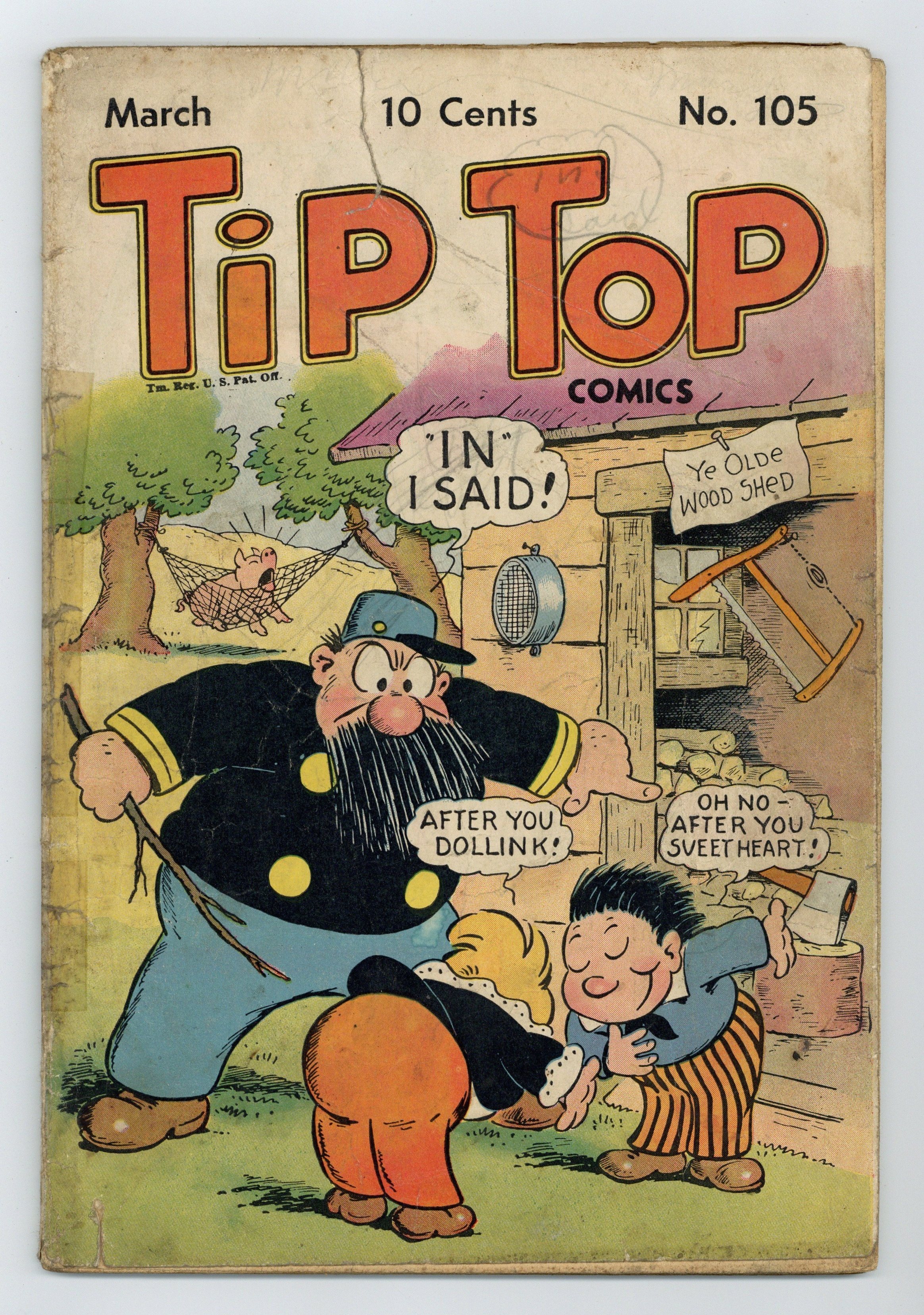 Cover by Rudolph Dirks. Stories and art by Al Capp, Ernie Bushmiller, Rudolph Dirks, Gus Mager, Dick Moores, Fred Methot, Paul Berdanier, Bernard Dibble, John Hix and Gus Arriola. Sometimes listed as Tip Top Comics Vol. 9 #9. Tip Top Comics presented color reprints of United Features newspaper comic strips. Bess's sleazy ex Roger tries to convince her that Windy's no good, but this backfires when she thinks she can't leave the baby with Windy. Fritzi Ritz drinks from the Fountain of Youth and starts growing younger. As if Marryin' Sam wasn't bad enough, Dan, the marryin' man who preceded Marryin' Sam, returns to Dogpatch, in a Li'l Abner storyline by Al Capp. Li'l Abner; The Captain and the Kids; The Triple Terror; Jim Hardy; Joe Jinks; Stamp Tips; Gordo; Bill Bumlin; Nancy; Fritzi Ritz; How It Began; Strange as It Seems. 48 pages, Full Color. Cover price $0.10.
