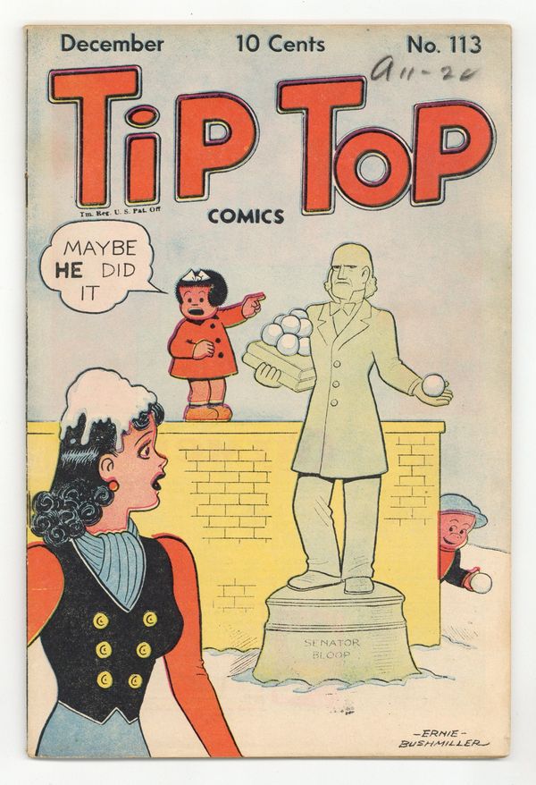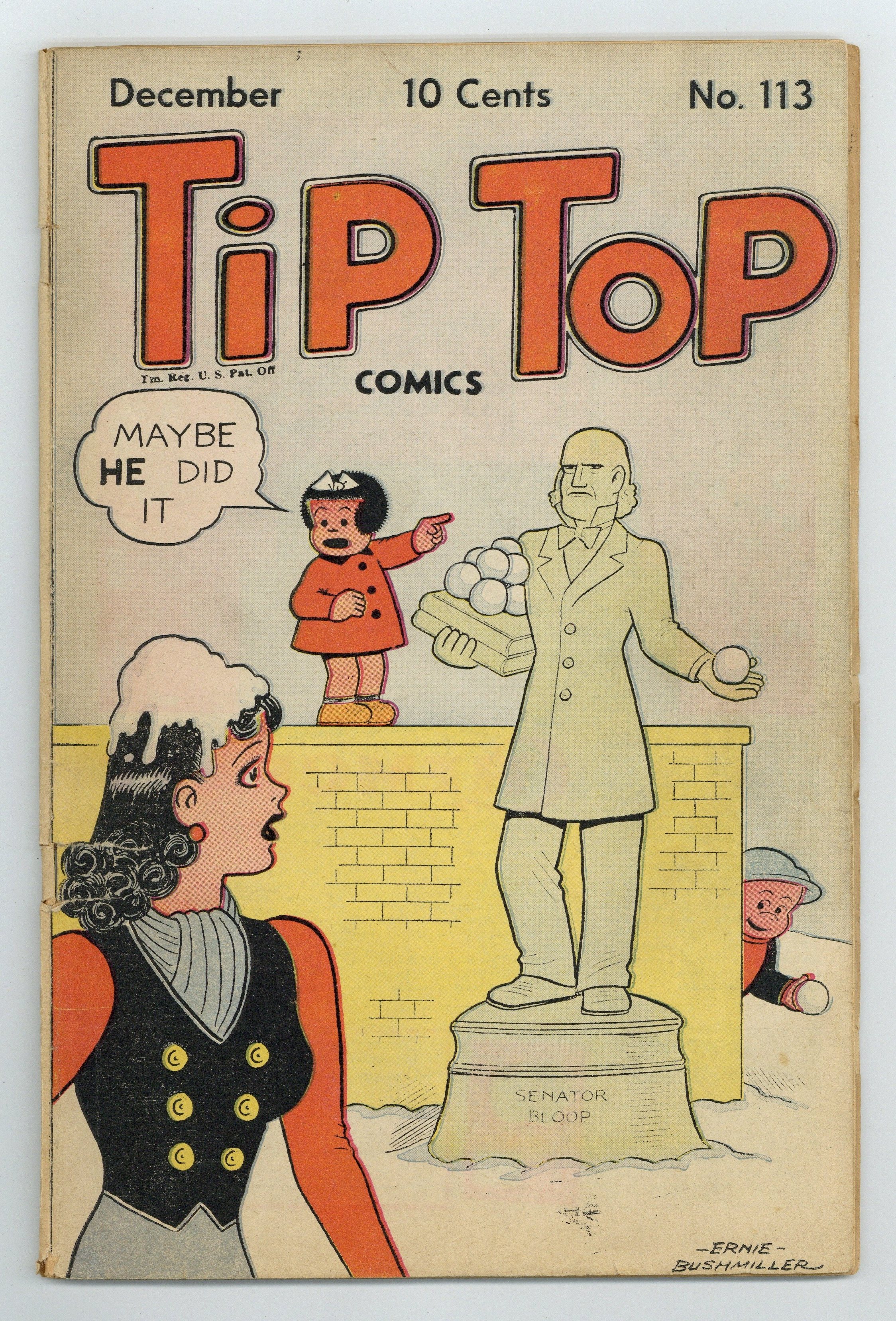 Cover by Ernie Bushmiller. Stories and art by Al Capp, Ernie Bushmiller, Rudolph Dirks, Dick Moores, Fred Methot, Paul Berdanier, Sam Leff, Ed Dodd, John Hix and Charles Plumb. Sometimes listed as Tip Top Comics Vol. 10 #5. Tip Top Comics presented color reprints of United Features newspaper comic strips. Joe Jinks learns that legendary boxer Killer Kayoe had a son, in a prelude to the Curly Kayoe saga. Sinister Mr. Klondyke returns, with a scheme for blackmail against Bess Giltedge. Bill Bumlin has amusing hallucinations at the dentist. Plus a Li'l Abner storyline by Al Capp. Li'l Abner; The Captain and the Kids; The Triple Terror; Jim Hardy; Stamp Tips; Curly Kayoe; Back Home Again; Ella Cinders; Bill Bumlin; Strange as it Seems; Nancy; Fritzi Ritz; How It Began. 48 pages, Full Color. Cover price $0.10.