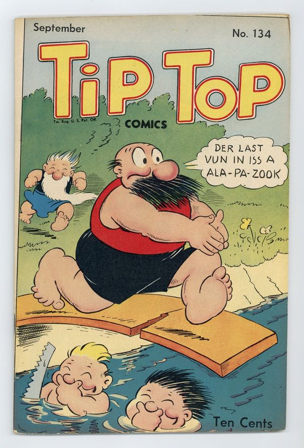 Cover by Rudolph Dirks. Stories and art by Al Capp, Ernie Bushmiller, Rudolph Dirks, Sam Leff, Bernard Dibble, Ernest Hix, Raeburn Van Buren and Gustavo Arriola. Sometimes listed as Tip Top Comics Vol. 12 #2. Tip Top Comics presented color reprints of United Features newspaper comic strips. Bathless Groggins invents a washing machine that destroys clothing, but also brings back the dead, in an Abbie an' Slats strip with fine art by Raeburn van Buren. Fritzi Ritz falls asleep at the beach with a tide coming in one of several strips that showcase Bushmiller's "good girl" art. Mr. Biltybux is so caught up in his story about baseball that he doesn't even notice when a robber steals his and Bombo's pants. Plus a Fearless Fosdick storyline by Al Capp. Li'l Abner; The Captain and the Kids; Stamp Tips; Curly Kayoe; Abbie an' Slats; El Bombo; Gordo; Nancy; Fritzi Ritz; Strange as It Seems; How It Began. 48 pages, Full Color. Cover price $0.10.