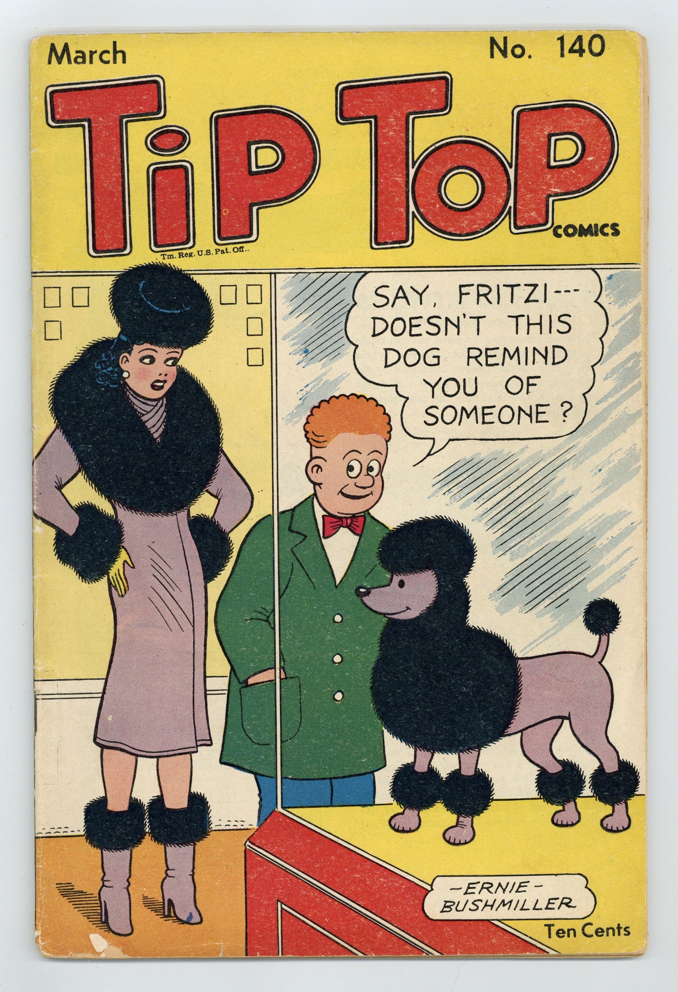 Cover by Ernie Bushmiller. Stories and art by Al Capp, Ernie Bushmiller, Rudolph Dirks, Sam Leff, Bernard Dibble, Ernest Hix, Raeburn Van Buren and Gustavo Arriola. Sometimes listed as Tip Top Comics Vol. 12 #8. Tip Top Comics presented color reprints of United Features newspaper comic strips. Famed conductor Mischa Bassoon arrives in Crabtree Corners and brings scandal with him, in an Abbie an' Slats strip with nice art by Raeburn van Buren. Bombo and Biltybux visit Bombo's uncle, who lives deep in the South American jungle. After she agrees to become a model to advertise pills, Daisy Mae is held prisoner, in a Li'l Abner storyline by Al Capp. Li'l Abner; The Captain and the Kids; Stamp Tips; Curly Kayoe; Abbie an' Slats; El Bombo; Gordo; Nancy; Fritzi Ritz; Strange as It Seems; How It Began. 48 pages, Full Color. Cover price $0.10.