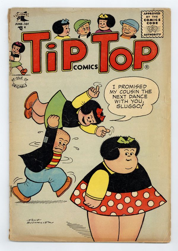 Cover by Ernie Bushmiller. Stories and art by Charles Schulz, Ernie Bushmiller, Mik, and Rudolph Dirks. Tip Top Comics presented color reprints of United Features newspaper comic strips. One of the backup strips in the comic is Charles Schulz's Peanuts; several strips are presented in full color. Sluggo goes out of his way to keep from making Nancy jealous. The Captain's golf date with the King is delayed, first by Mama, then by Hans and Fritz. The Family Scrapbook; Nancy; Peanuts; The Captain and the Kids; Family Painting Parties; Jitter-Bug; Ferd'nand. 32 pages, Full Color. Cover price $0.10.