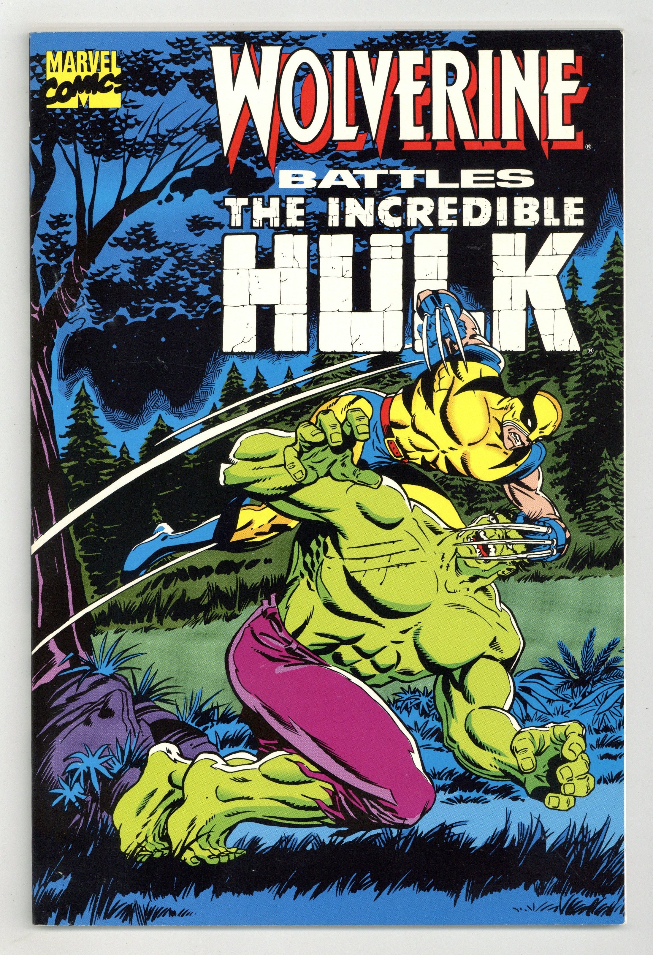 1ST PRINTING; Reprints Incredible Hulk 180-181, the first appearance of Wolverine. Cover art by Herb Trimpe. And The Wind Howls...Wendigo!, script by Len Wein, pencils by Herb Trimpe, inks by Jack Abel; Hulk is in Canada looking for some peace and quiet when he is mysteriously drawn to a cave inhabited by the sister of the man who became the Wendigo; Marie and Georges plan on transferring the power of the Wendigo to the Hulk, thus restoring Paul Cartier to his normal life; Marie's magic isn't strong enough, however, and just as Wendigo shows up, the Hulk wakes up from his magical slumber and the two battle. And Now...The Wolverine, script by Len Wein, pencils by Herb Trimpe, inks by Jack Abel; Canadian super-agent Wolverine teams up with the Hulk to battle Wendigo; Once the monster is felled, however, Wolvie turns on the Hulk and the two battle. At The Sign Of The Lion starring Wolverine, Hercules, and Sibyl, script by Mary Jo Duffy, pencils by Ken Landgraf, inks by George Perez. Wolverine: The Evolution of a Character article by Peter Sanderson, pencils by Paul Smith, John Romita, John Byrne, Frank Miller, and John Romita Jr., inks by Joe Rubinstein, Terry Austin, and Dan Green; Text piece with clip art discussing the creation and evolution of the Wolverine character. Wolverine/Hulk pinup, pencils by Herb Trimpe, inks by Jack Abel. 52 pgs., full color. Cover price $4.95.