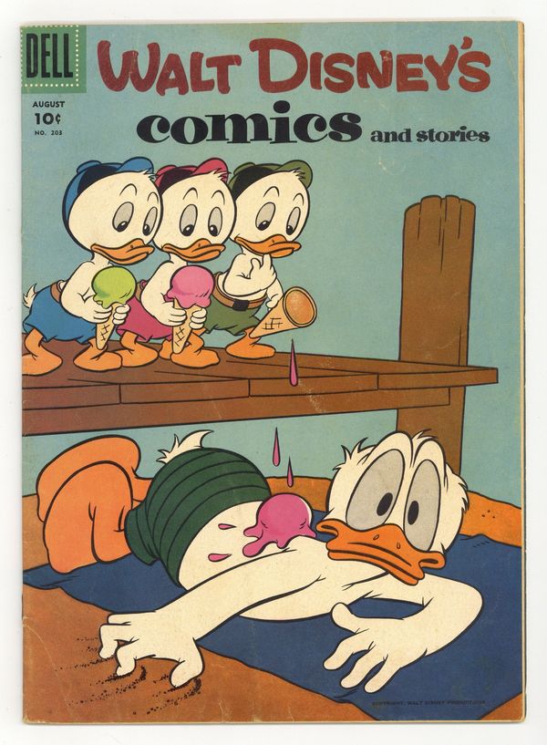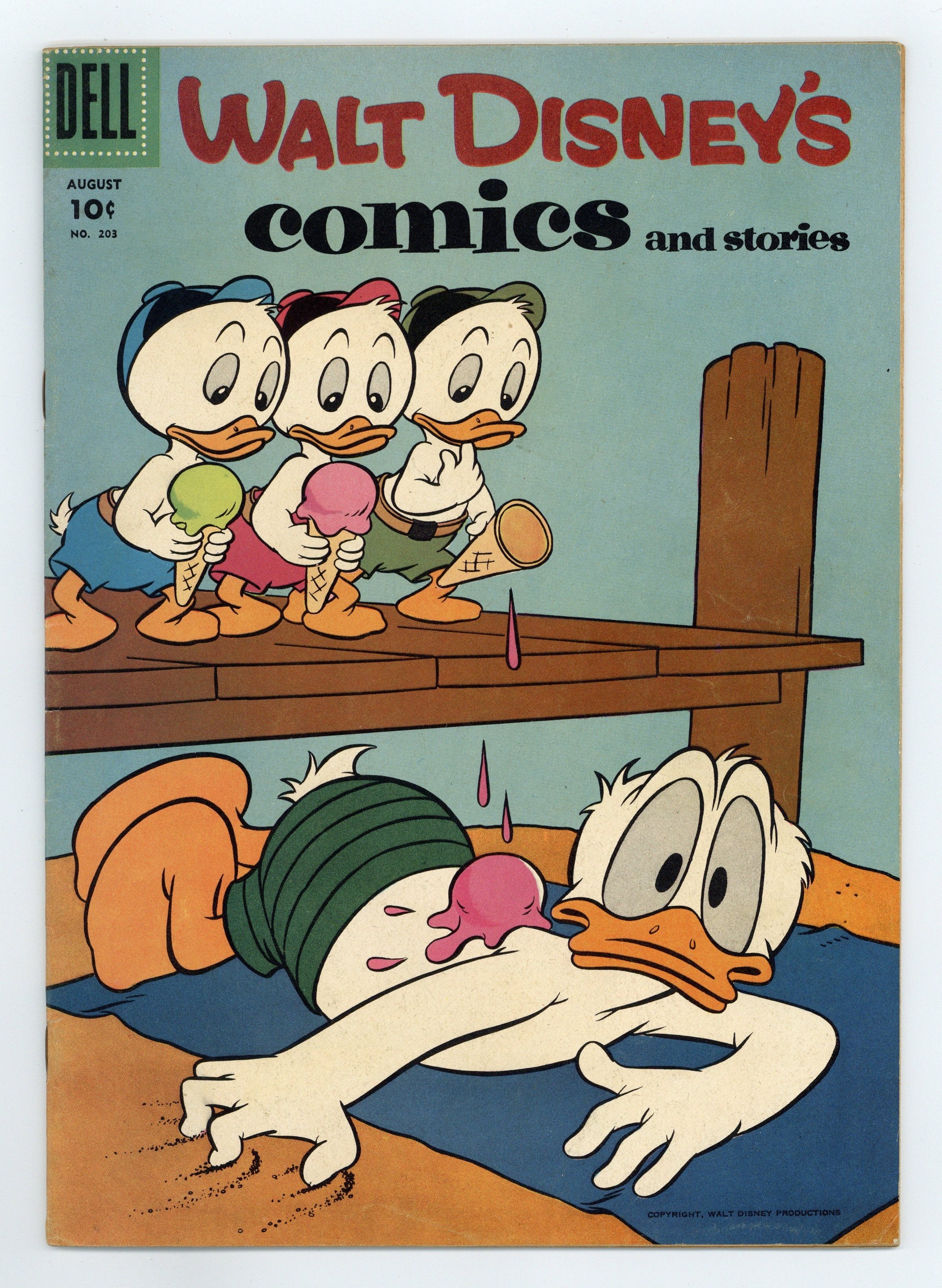 Tags: Disney Ducks & MicePublished Aug 1957 by Dell/Gold Key.$15.7510¢ Edition. Cover by Tony Strobl. Stories and art by Carl Barks, Don Christensen, Carl Fallberg, Jack Bradbury, Paul Murry, Tony Strobl, Bob Karp, and Al Taliaferro. Sometimes listed as Vol. 17 #11. The long-running vehicle for Disney character comics featured art by Carl Barks, the legendary Good Duck Artist. Mickey and Goofy seek a crystal ball for Minnie's costume. In a story by Barks, Huey, Dewey and Louie get jobs as delivery boys. The Big Bad Wolf tries hypnosis to make Li'l Bad Wolf turn bad. Donald Duck; Li'l Bad Wolf; Pluto; A Will and a Way; Mickey Mouse: The Crystal Ball Quest. 32 pages, Full Color. Cover price $0.10.