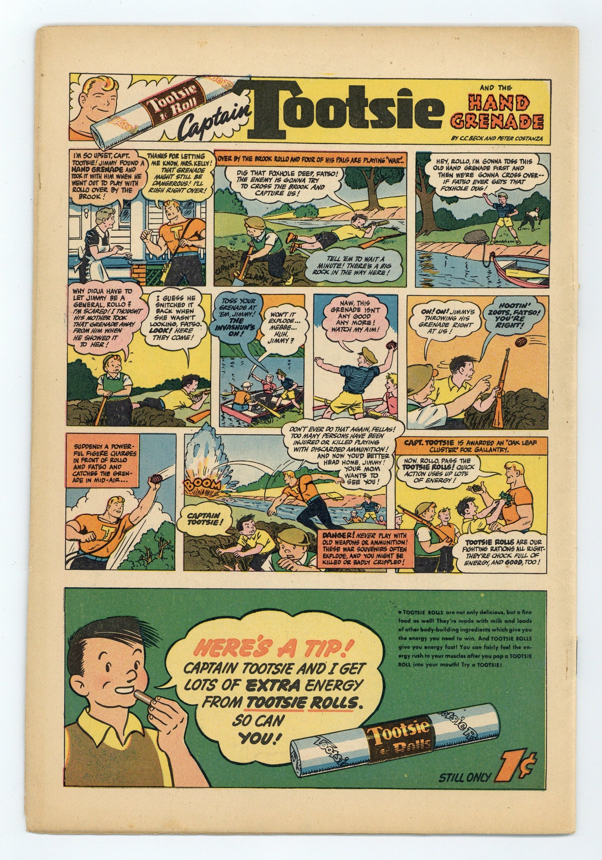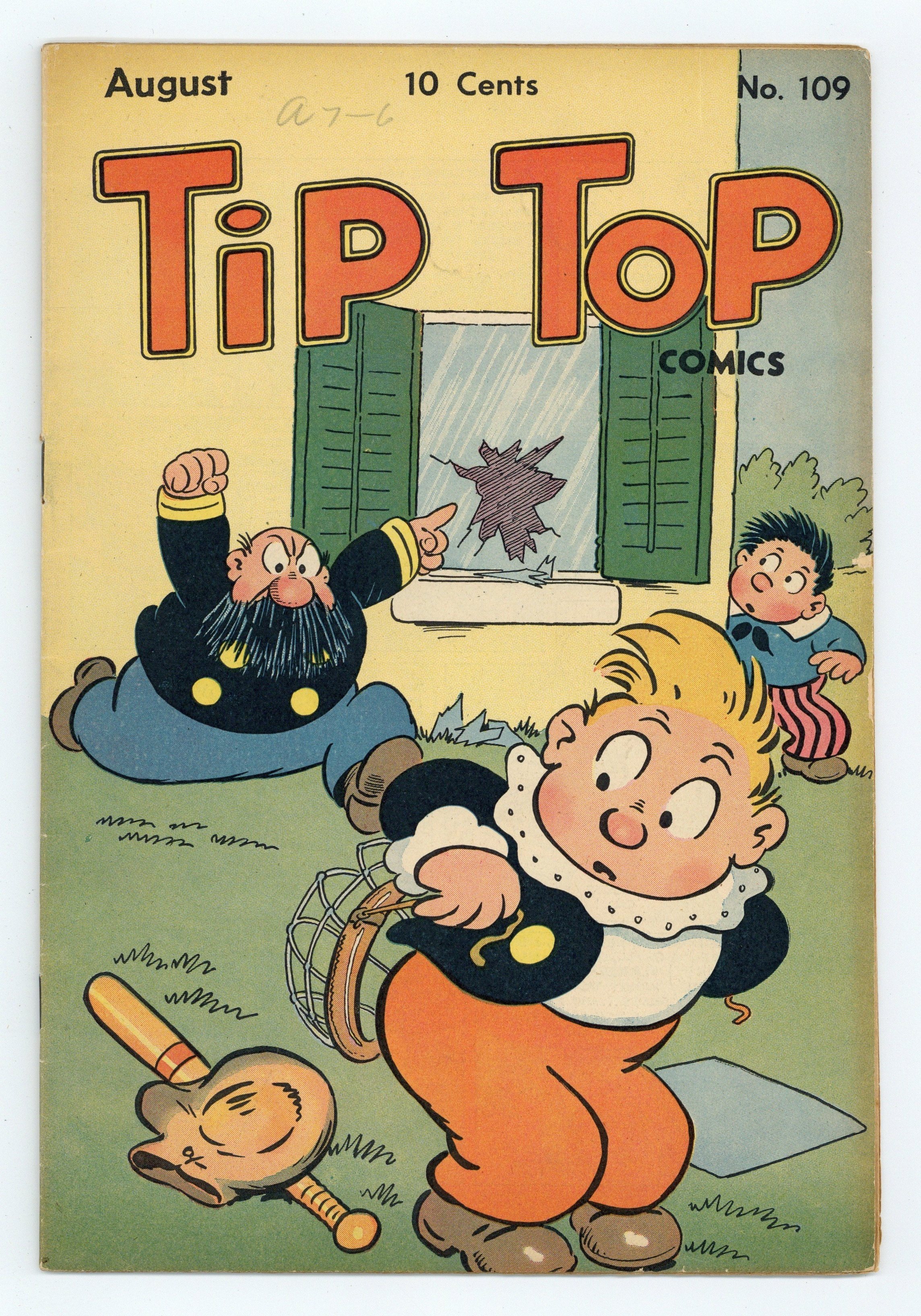 Tags: Comic Strip ReprintsPublished Aug 1945 by United Features Syndicate.$35.00Cover by Rudolph Dirks. Stories and art by Al Capp, Ernie Bushmiller, Rudolph Dirks, Dick Moores, Fred Methot, Paul Berdanier, and Bernard Dibble. Sometimes listed as Tip Top Comics Vol. 10 #1. Tip Top Comics presented color reprints of United Features newspaper comic strips. Released from active duty and back in America, superhero team the Triple Terror battles the forces of black marketer Black Sam. Fritzi's sunbathing causes a health hazard, in a strip showcasing Ernie Bushmiller's good-girl art. Ella Cinders gets her comedy script mixed up with her boss's radio speech, and doesn't realize it until she hears him on air. Plus a Li'l Abner storyline by Al Capp. Li'l Abner; The Captain and the Kids; The Triple Terror; Jim Hardy; Stamp Tips; Ella Cinders; Nancy; Fritzi Ritz; How It Began. 32 pages, Full Color. Cover price $0.10.