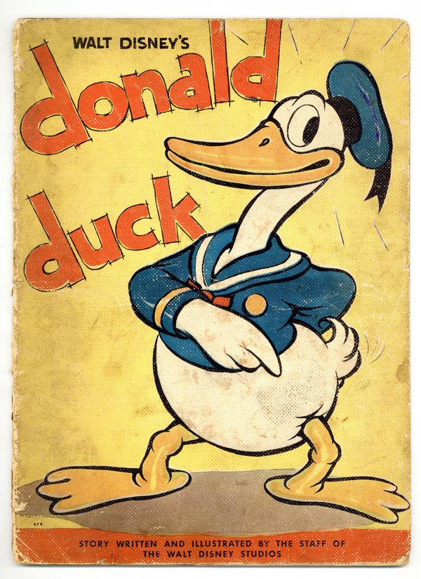 Whitman #978, 1935. First book ever devoted to Donald Duck. Text story with a large illustration on every page. 9 1/2-in. x 12 3/4-in., 16 textured linen pages, full color.