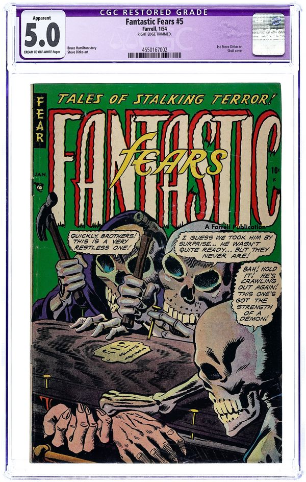 "My Coffin Must Wait"; Seth is informed that his wife Martha is dying; He vows to fulfill her last wish, driving her through a blizzard, defeating some bank robbers who want to hijack his car, and crashing through a police roadblock to reach town; Seth says he promised Martha she'd have her photograph taken one last time, and he gets Mr. Townsend to do it just before she dies. "Caught in the Graft"; Corrupt city official Sam is caught and sentenced to prison; Since he suffers from claustrophobia, Sam can't tolerate confinement; Working in the prison morgue, Sam learns the bodies are subsequently sent to the city morgue, a building constructed under his crooked supervision; Sam climbs into a coffin and escapes from prison. "Ghost Gift" text story; Dan finds his war comrade Don in Africa, now in possession of a valuable jewel mine. "Stretching Things," script by Bruce Hamilton, art by Steve Ditko; Dawson suffers from brittle bone syndrome, but Dr. Doyle invents "muiclac" to cure him; He discovers this makes him "elastic" and murders Doyle to keep his secret. "Escape from Hell!"; Criminal Richard Benton dies and goes to Hell; He's sentenced by Satan to drag a boulder around for eternity; Benton struggles to climb a mountain to freedom, plagued by demons and hindered by the boulder, only to learn "there is no escape from Hell!" "Temple of the Beast"; In Siam, American tourists Sam and Anne buy "the hand of Sivak," a local god; The vendor later buys it back from Sam but the hand comes alive and strangles him; Anne recovers the hand and mails it to the USA. 36 pgs., full color. Cover price $0.10.