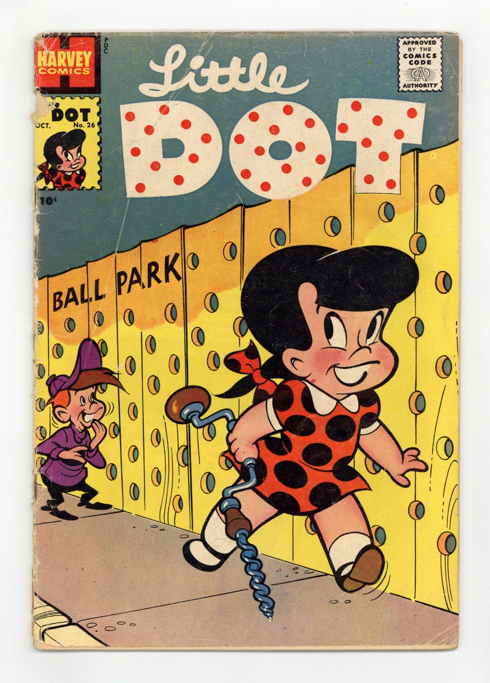Stories and art by Steve Muffatti and Warren Kremer. One of the mainstays of Harvey's long-running kids' comics, Little Dot also features Richie Rich and Little Lotta. Little Dot meets another wacky relative, Uncle Bleary. Richie Rich gets a taste of married life while playing house with his wealthy friend Cynthia. Being sent to his room is not really a punishment for Richie. Spotty Trading; Uncle Bleary; Little Lotta: Slim Pickings; Practice Makes Perfect; Better than Beauty; Richie Rich: Man of the House. 32 pages, Full Color. Cover price $0.10.