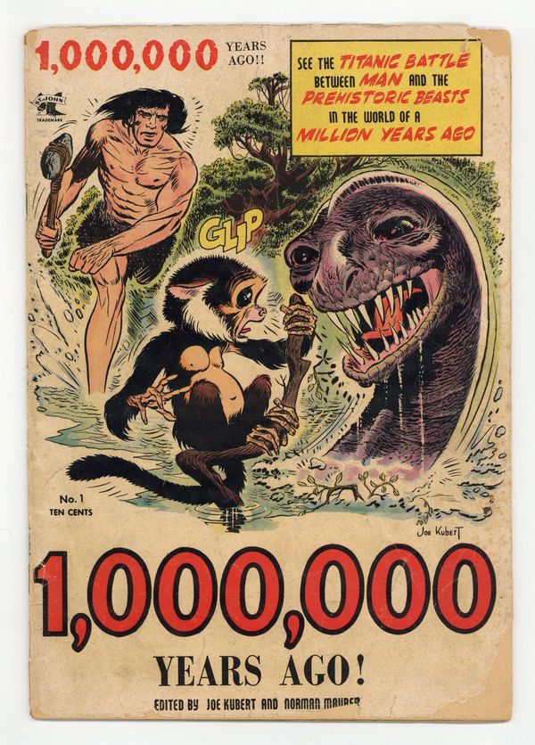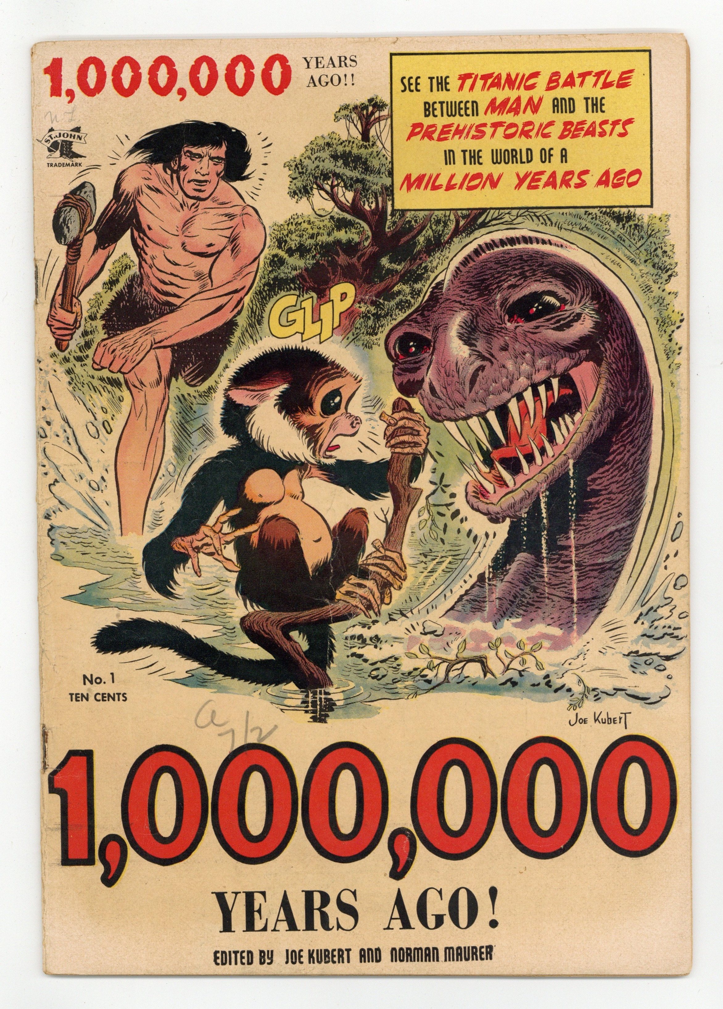 Cover by Joe Kubert. Stories and art by Joe Kubert and Norman Maurer. Comics legend Joe Kubert won fans early in his career with his tales of Tor, a caveman struggling for survival in a world where humans co-exist with dinosaurs. Co-creators Joe Kubert and Norman Maurer put themselves into the comic, to introduce Tor and his world. Tor rescues a friend while hunting, in a story that reveals how he met his pet Chee-Chee. The Wizard of Ugghh tries to teach magic to Klukk, son of Dripp. While visiting the museum, Danny falls asleep and dreams himself into his own caveman adventures. Tor; Chee-Chee's Glossary; 1,000,000 B.C. History of Prehistoric Animals: Man, Stegosaurus, Tyrannosaurus; Wizard of Ugghh; Underworld; Danny Dreams. Final issue under this title; Tor's adventures continue in 3-D Comics Tor (1953 St. John). 32 pages, Full Color. Cover price $0.10.
