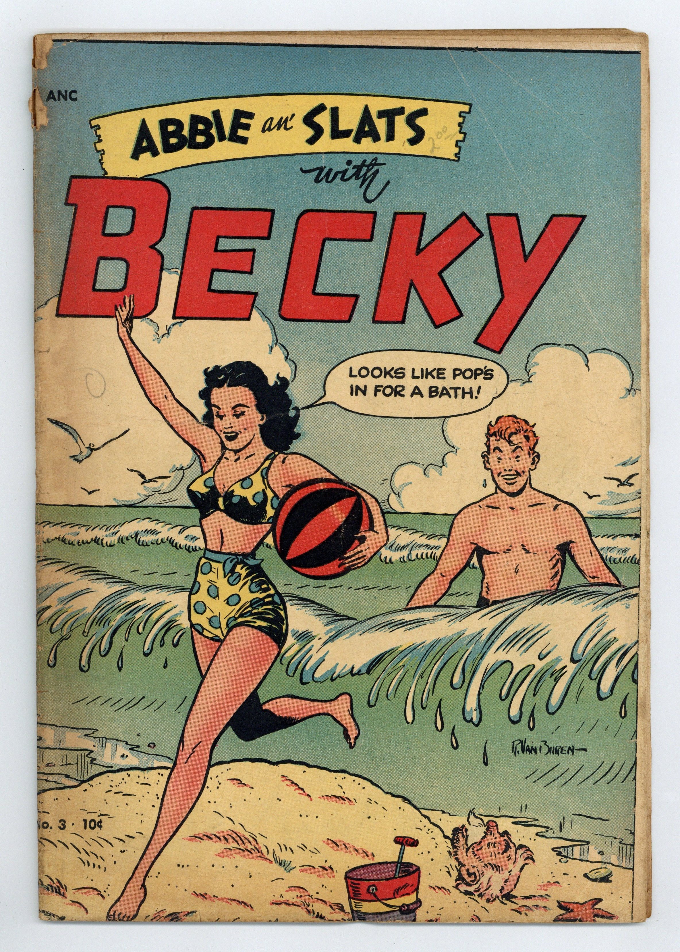 Cover by Raeburn Van Buren. Stories and art by Raeburn Van Buren and Budd Sheppard. The comic-strip adventures of city boy Slats, his small-town sweetheart Becky, and Becky's reprobate father "Bathless Groggins," with exceptionally nice art by Raeburn Van Buren. Wealthy Judy Hagstone sets her sights on Slats, so her powerful father arranges to have Becky transferred out of town. Then Judy tries to make Slats forget Becky by giving him marijuana! But when cleaning lady Mrs. McMousey climbs the town square statue and sings "Frankie and Johnny," the jig is up. Swimsuit cover and comic strip-style good-girl art by Raeburn Van Buren. 32 pages, Full Color. Cover price $0.10.